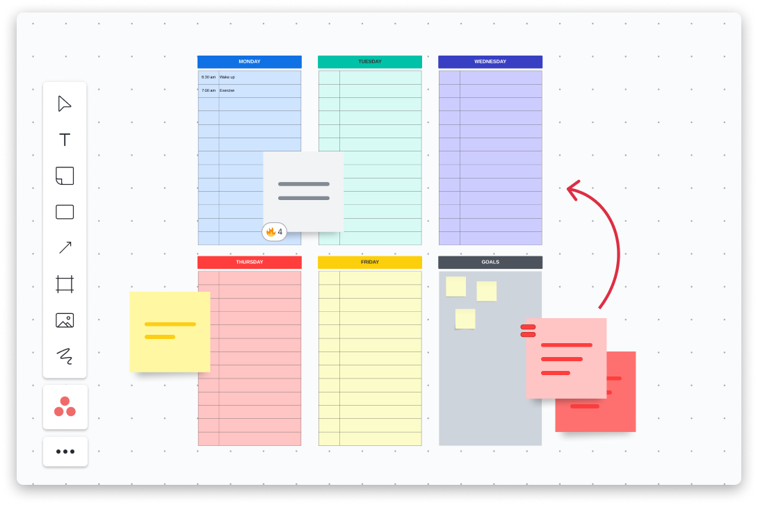 Pesquisas mostram que ter uma representação visual da sua agenda pode ajudar a realizar tarefas, permanecer motivado e até mesmo reduzir a ansiedade. Os modelos e ferramentas de planejamento online do Lucidspark são projetados para ajudar você a entender o que precisa ser feito e quando, sem o incômodo de ter que lembrar toda a sua agenda ou carregar uma agenda tradicional.
