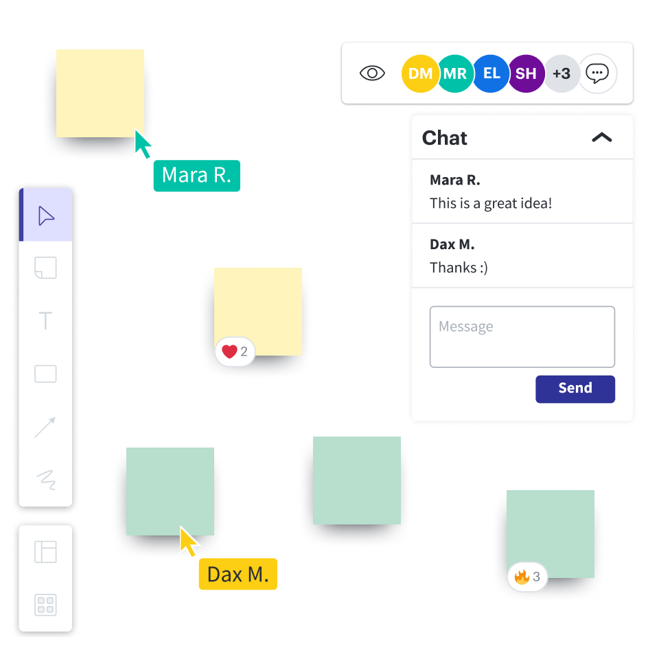 Compartilhe ideias com sua equipe em um espaço de trabalho visual feito para inspirar. Entre em murais simultâneos e envie e receba opiniões pelo bate-papo. Dê vida à sua visão com as nossas notas adesivas, emojis e um temporizador prático. Obs.: o Lucidspark ajuda você a organizar reuniões com muita facilidade.