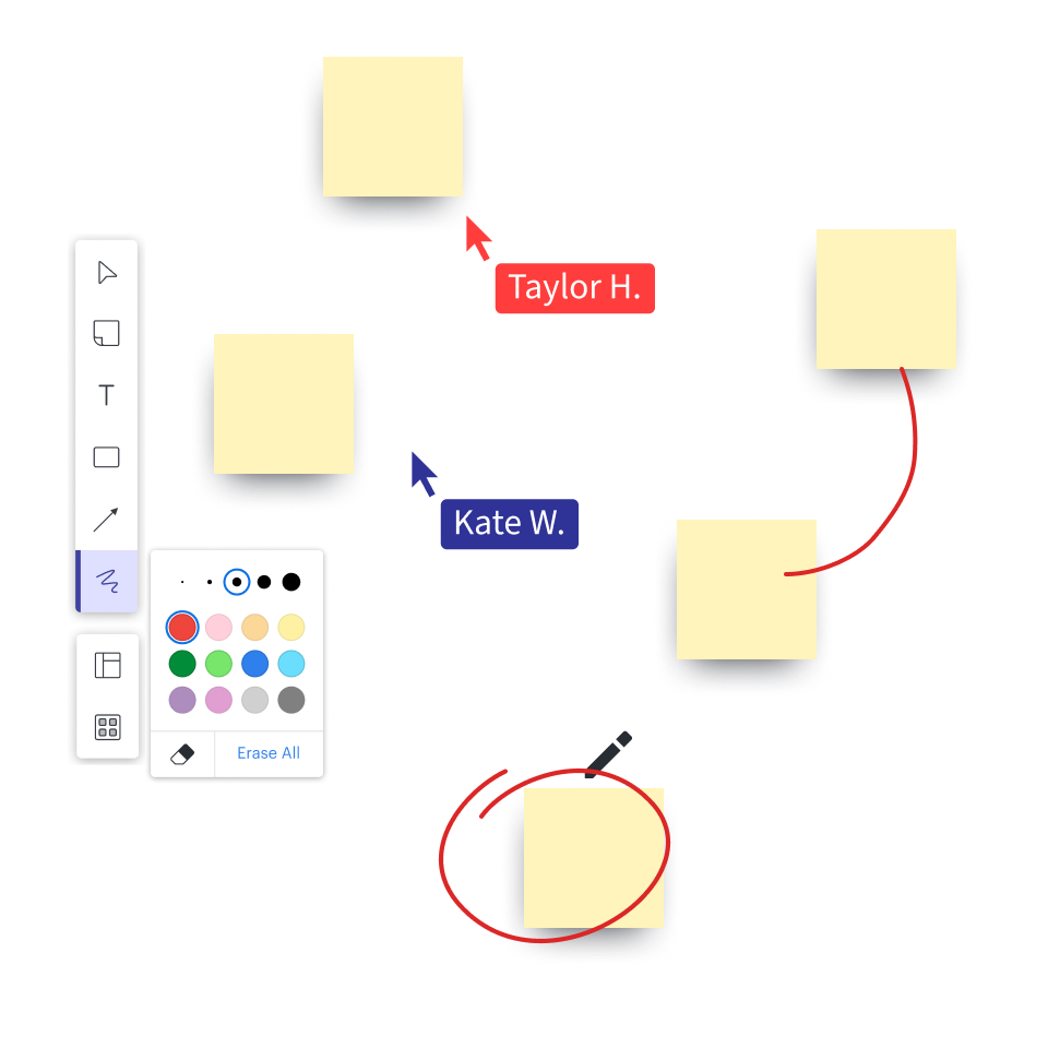 Para registrar as ideias da equipe, use notas adesivas, desenho à mão livre e cores distintas para cada participante. Trabalhem juntos em uma tela de desenho infinita que expande para acomodar qualquer ideia, não importa quão grande.