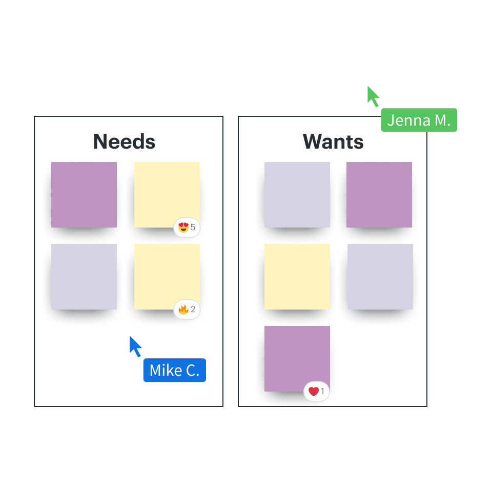 Não desperdice o seu esforço. Coloque seus rascunhos e notas adesivas em prática votando em ideias, agrupando conceitos por temas e tendências e criando fluxos de trabalho e uma documentação para o projeto.
