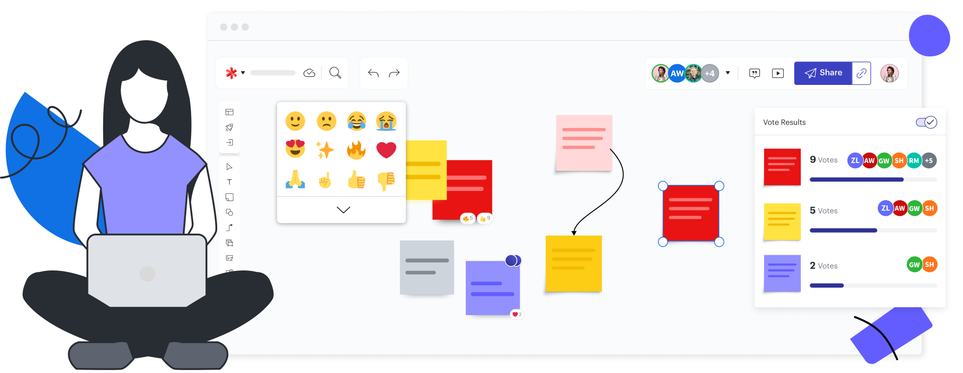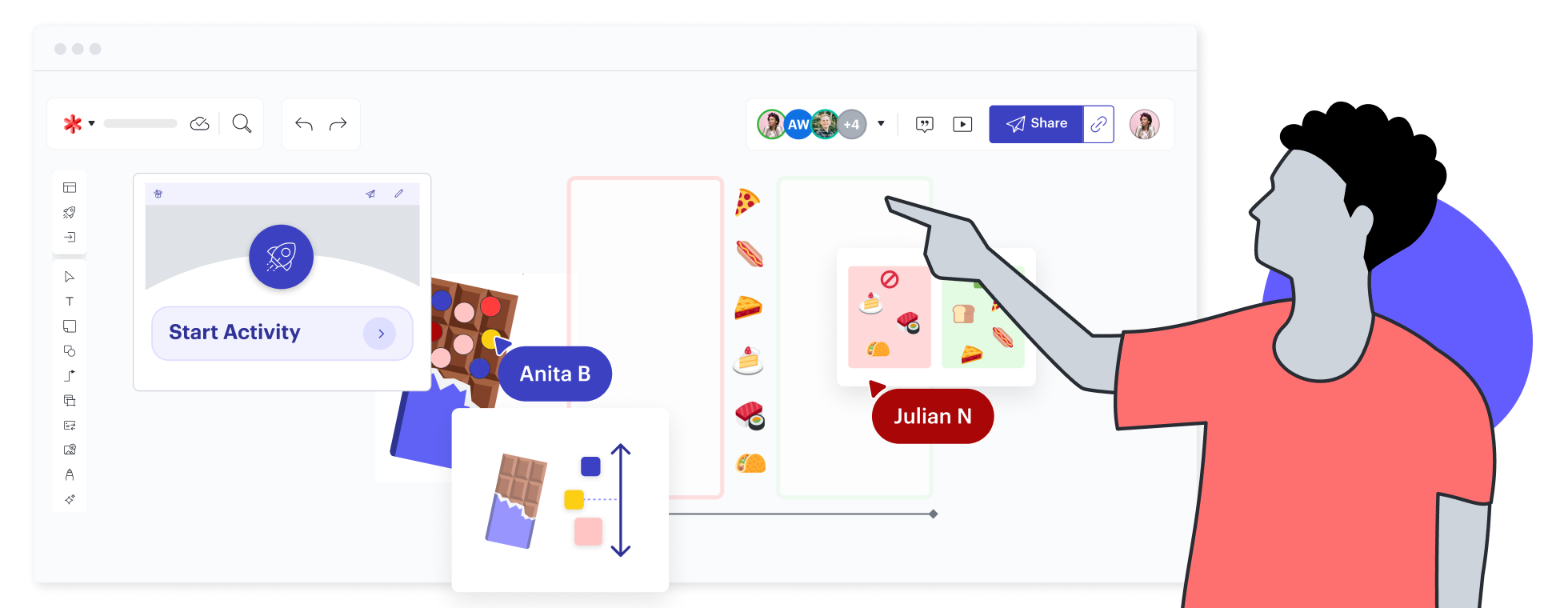 O Lucidspark é intuitivo para todos os usuários, não importa quais sejam suas habilidades técnicas. Arraste notas adesivas, formas e linhas para a tela. Adicione rapidamente texto, imagens, reações de emoji, comentários e muito mais.