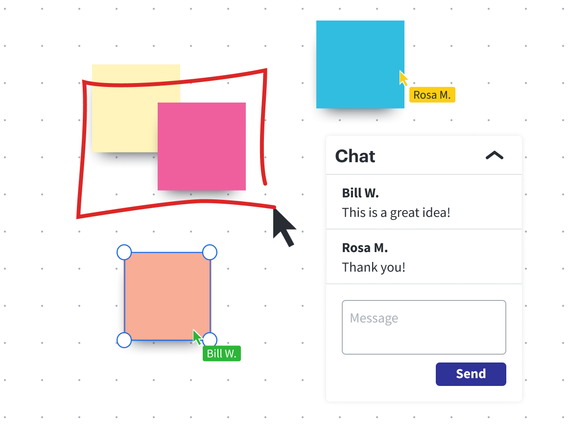 Registre suas grandes ideias com notas adesivas, ferramentas de desenho à mão livre e uma tela de desenho infinita.
