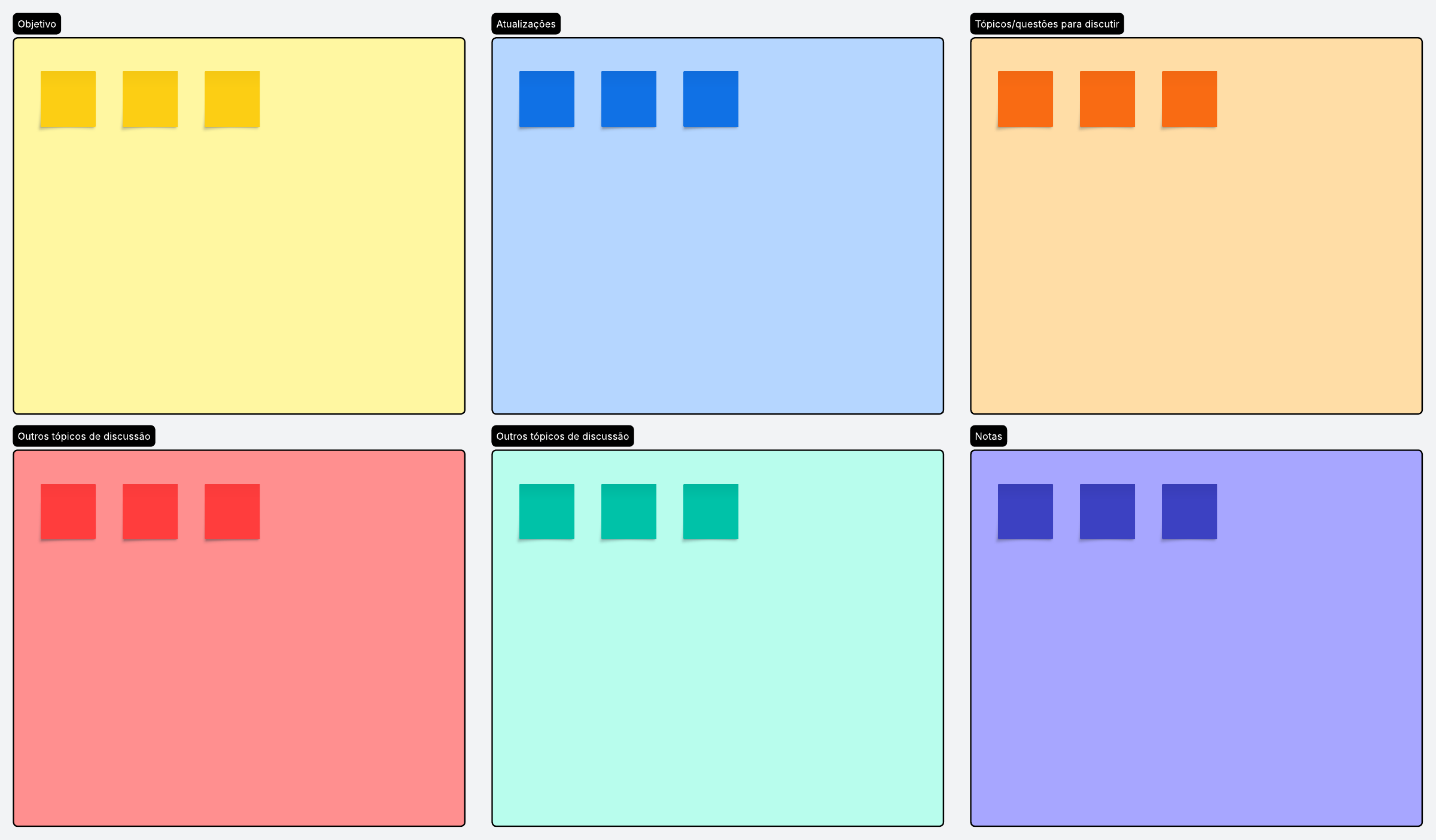 A agenda para reuniões de equipe ajudará sua equipe a permanecer focada e oferecer aos participantes uma boa ideia do que esperar. Documente seus objetivos, as atualizações e os tópicos para discutir durante a reunião. Além disso, há um espaço para criar itens de ação e fazer anotações durante a reunião.