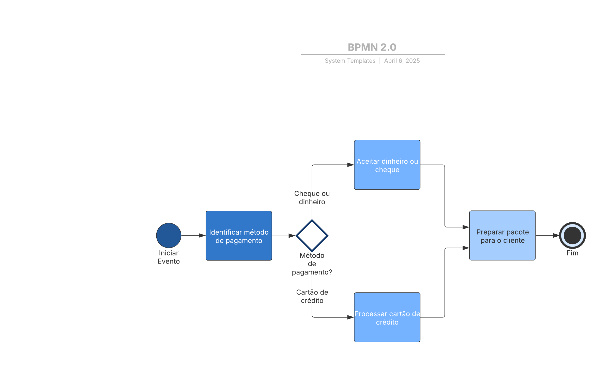 Abra este template para exibir um exemplo detalhado de um diagrama BPMN 2.0, personalizável de acordo com o seu caso de uso.