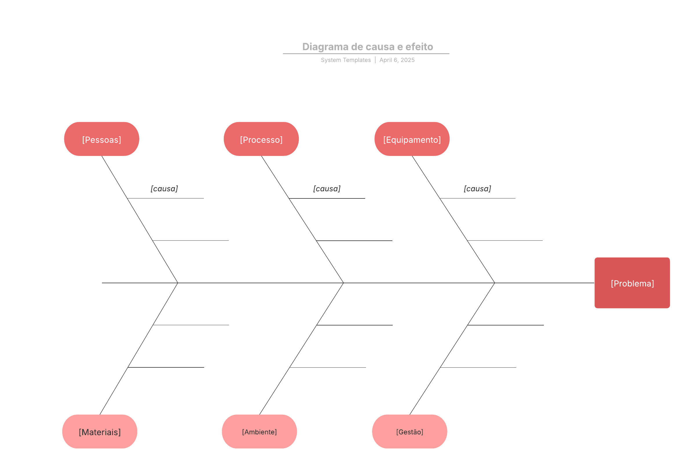 Abra este template para exibir um exemplo detalhado de um diagrama de causa e efeito, personalizável de acordo com o seu caso de uso.