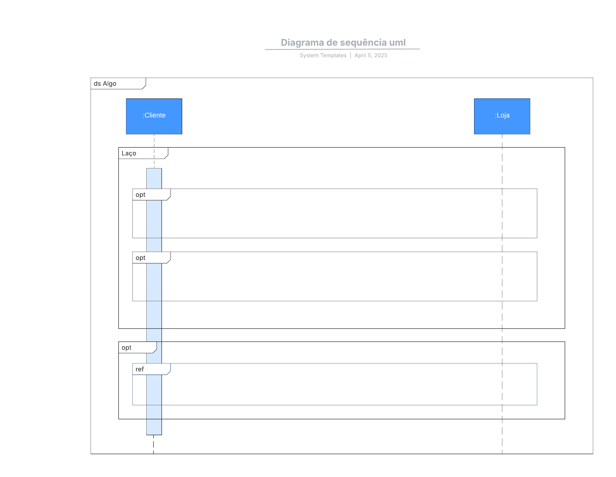Abra este modelo e adicione conteúdo para personalizar o diagrama de sequência UML de acordo com seu caso de uso.