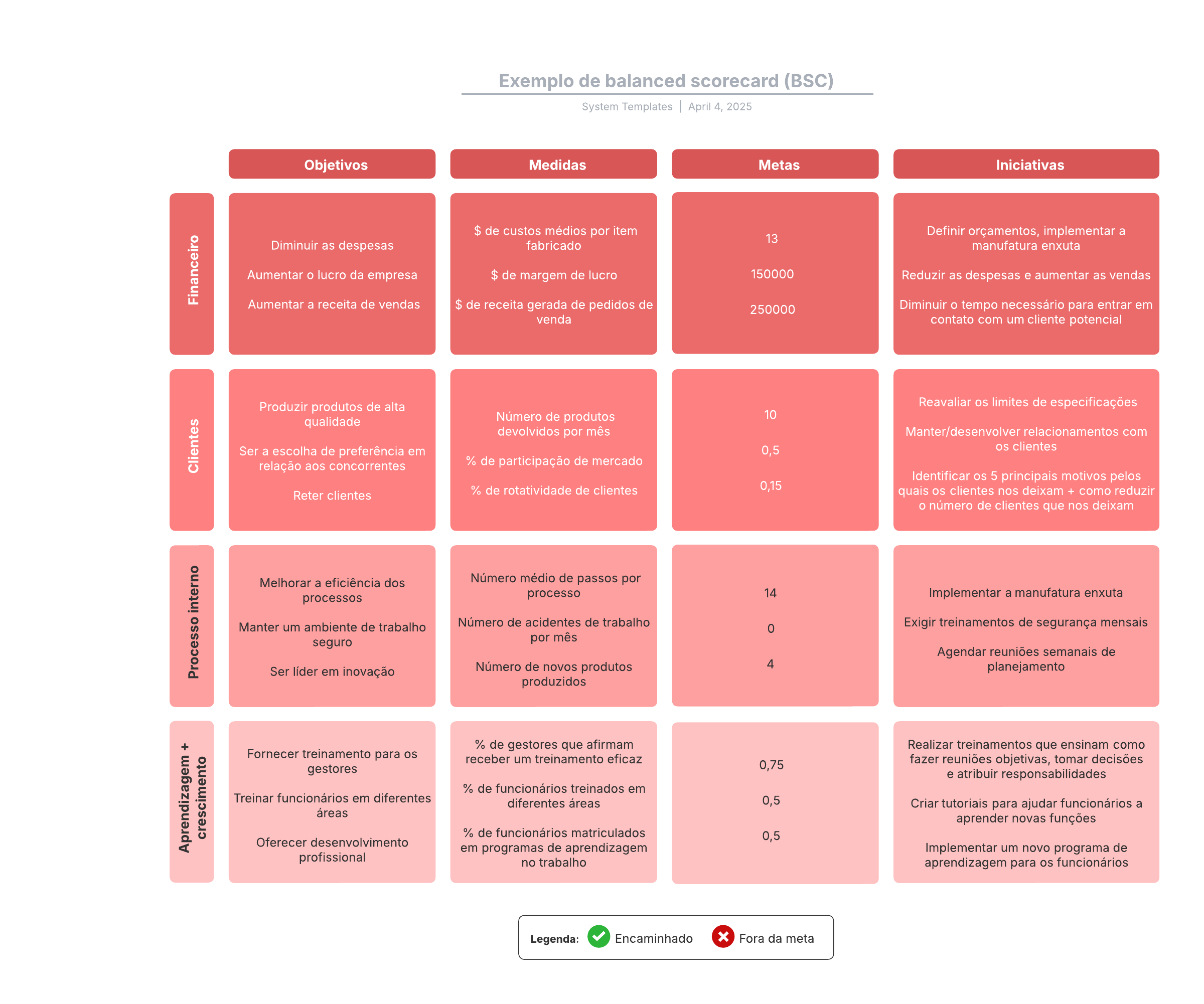 Abra este modelo para exibir um exemplo detalhado de um indicador balanceado de desempenho (BSC, balanced scorecard), personalizável de acordo com seu caso de uso.