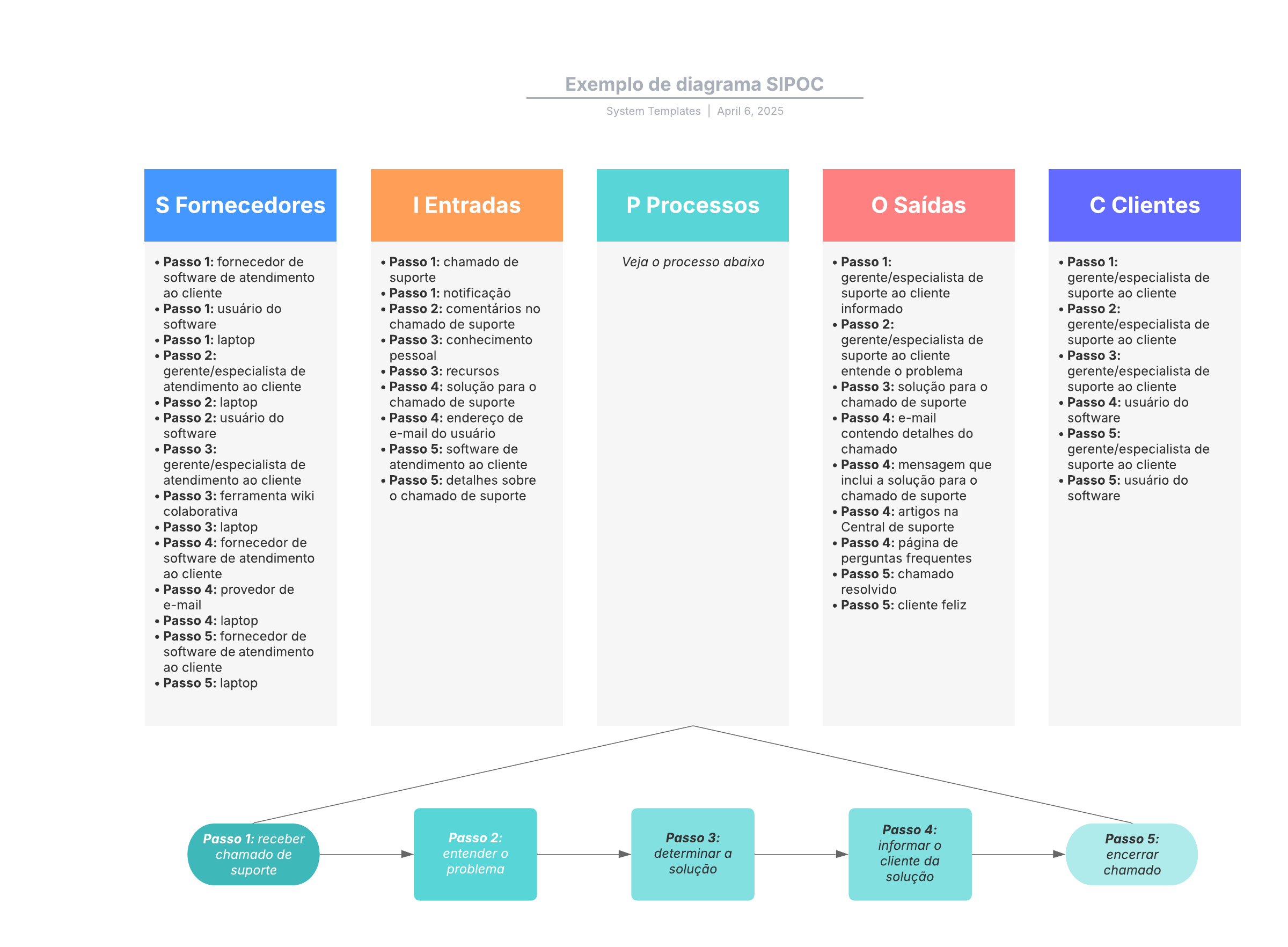 Abra este modelo para exibir um exemplo detalhado de um diagrama SIPOC básico, personalizável de acordo com seu caso de uso.