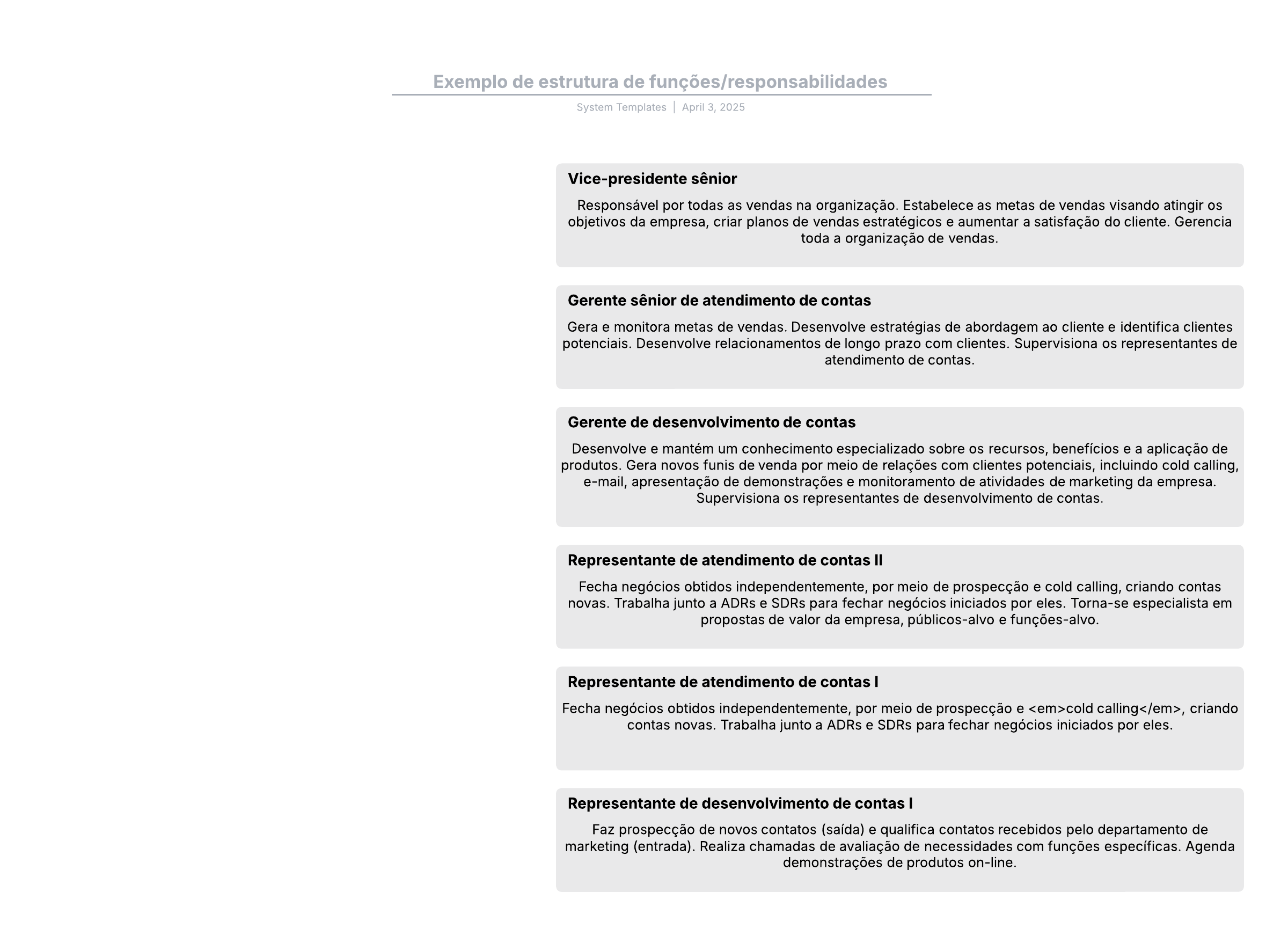 Abra este modelo para exibir um exemplo detalhado de uma estrutura de funções/responsabilidades, personalizável de acordo com seu caso de uso.