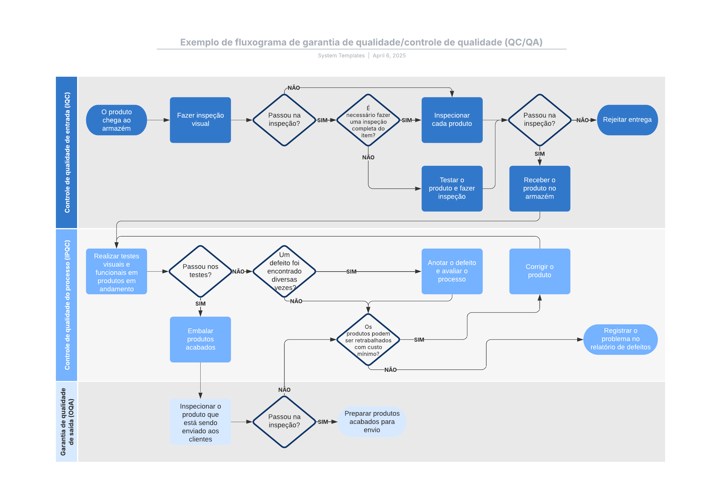 Abra este modelo para exibir um exemplo detalhado de um fluxograma de garantia de qualidade/controle de qualidade (QC/QA), personalizável de acordo com seu caso de uso.