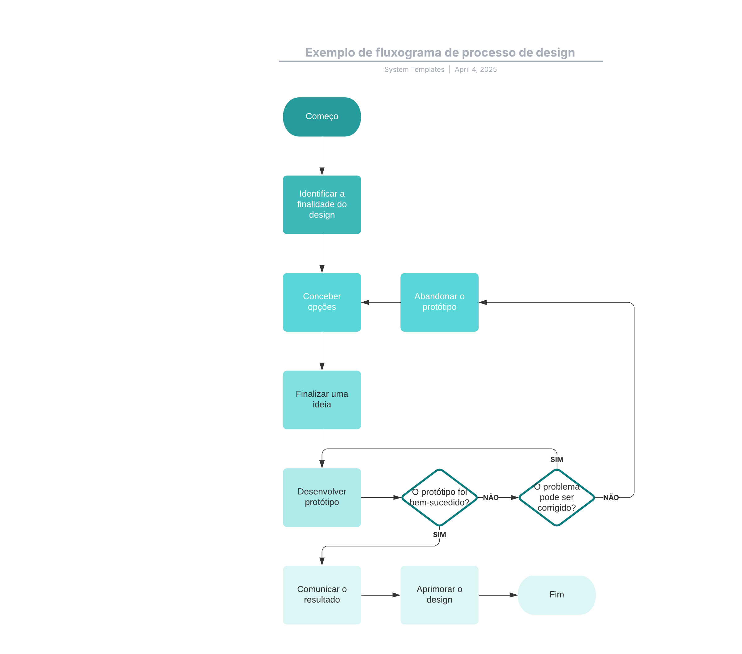 Abra este modelo para exibir um exemplo detalhado de um fluxograma de processo de design, personalizável de acordo com seu caso de uso.