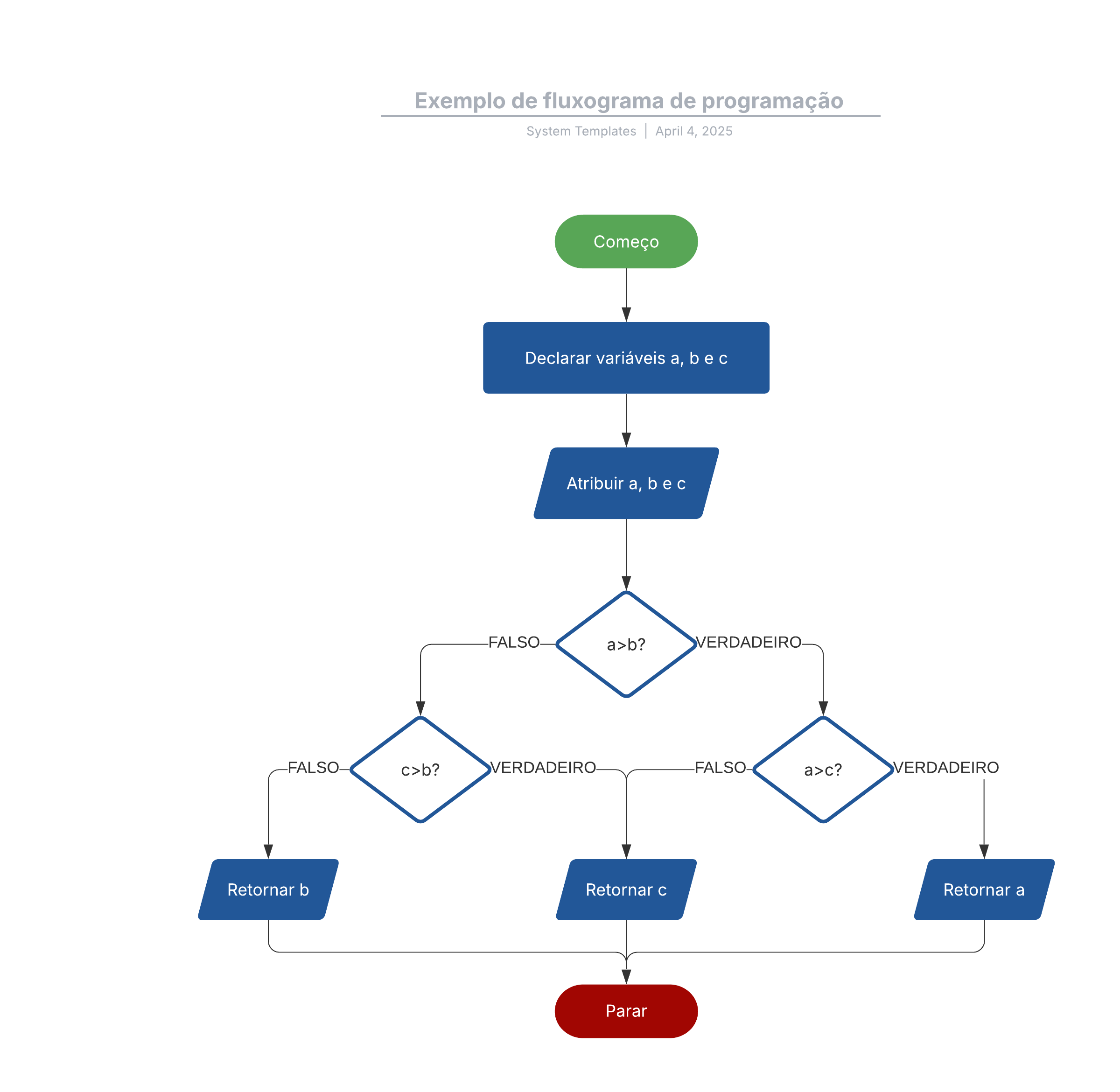 Abra este modelo para exibir um exemplo detalhado de um fluxograma de programação, personalizável de acordo com seu caso de uso.