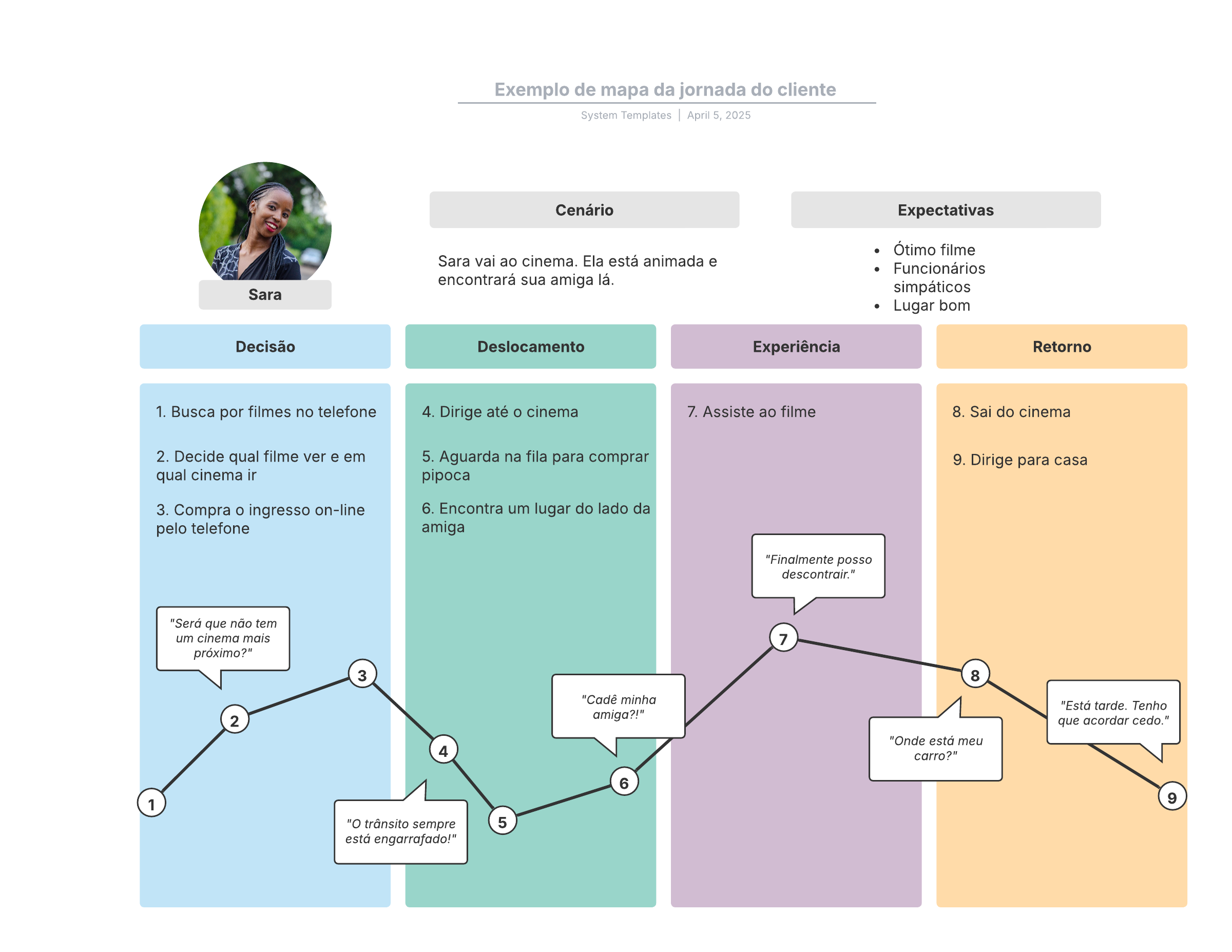 Abra este modelo para ver um exemplo detalhado de um mapa de jornada do cliente, personalizável de acordo com seu caso de uso.