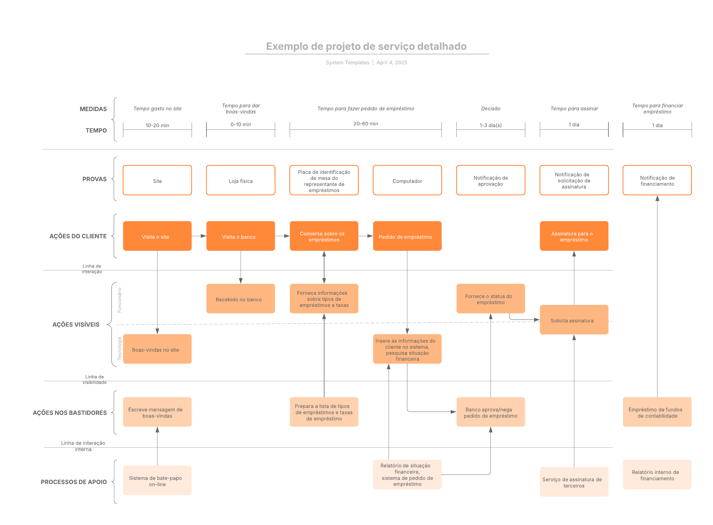Este diagrama de projeto de serviço visualiza as conexões entre os serviços e processos que os clientes vivenciam quando solicitam um empréstimo. O projeto de serviço é útil porque pode ajudar a identificar deficiências e pontos fracos no processo atual. O projeto de serviço também pode ser usado para mapear processos ideais (melhorados) para otimizar a experiência do cliente.