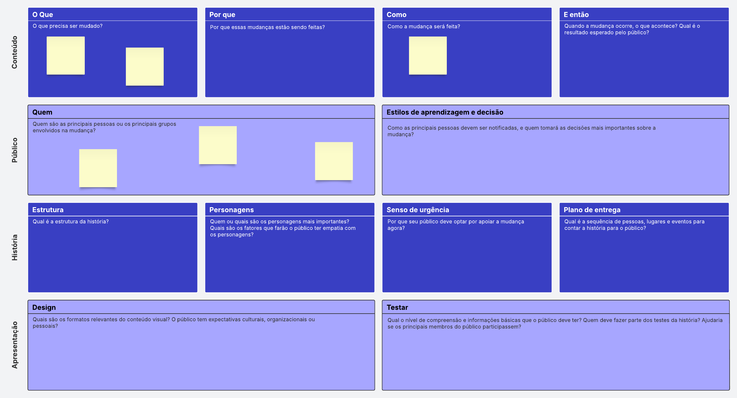 Planeje e resuma as mudanças importantes para o seu público (produtos, processos etc.). Descreva detalhadamente as mudanças e como a história deve ser contada, estrutural e visualmente.