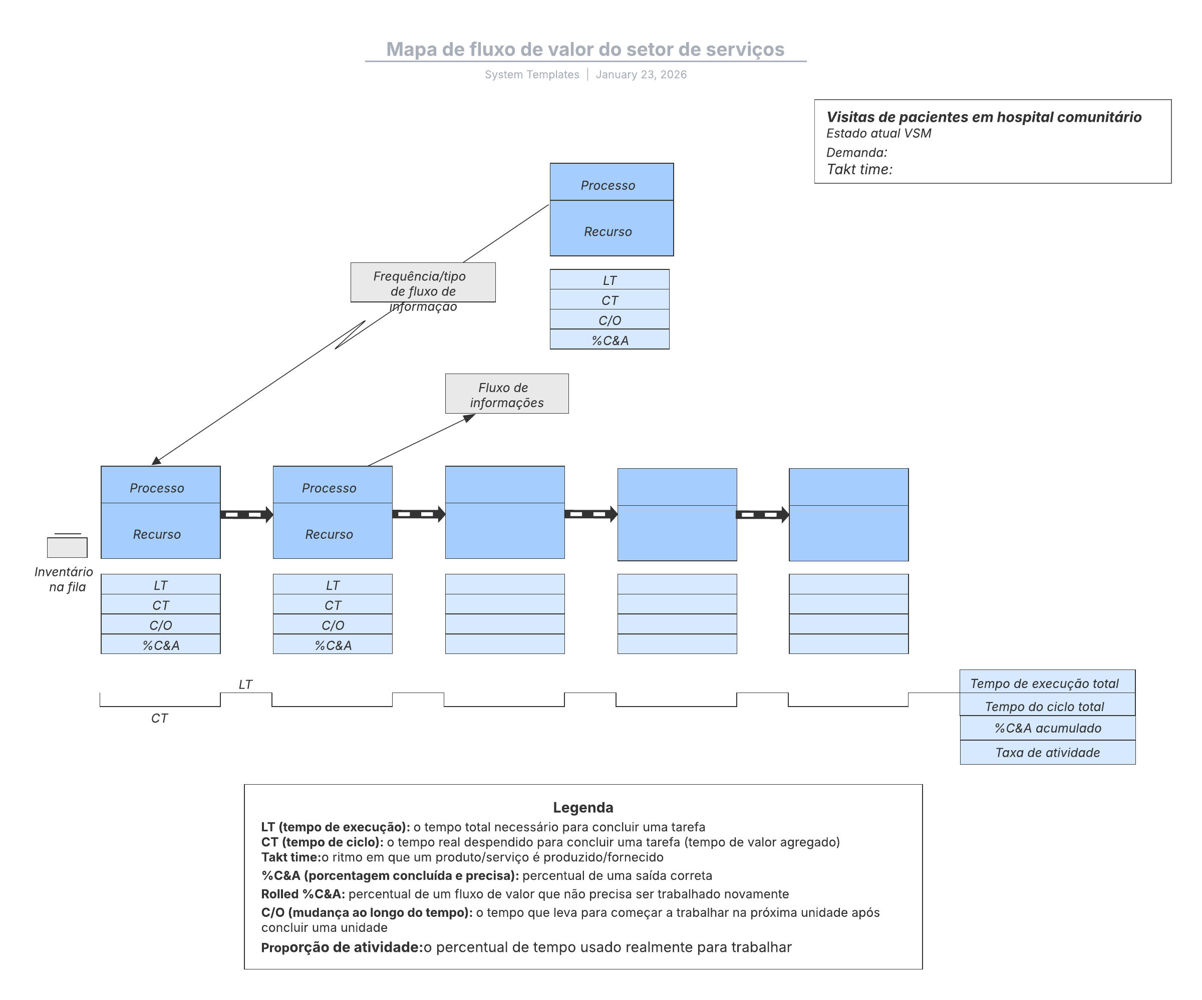 Abra este modelo e adicione conteúdo para personalizar o mapa de fluxo de valor (setor de serviços) de acordo com seu caso de uso.