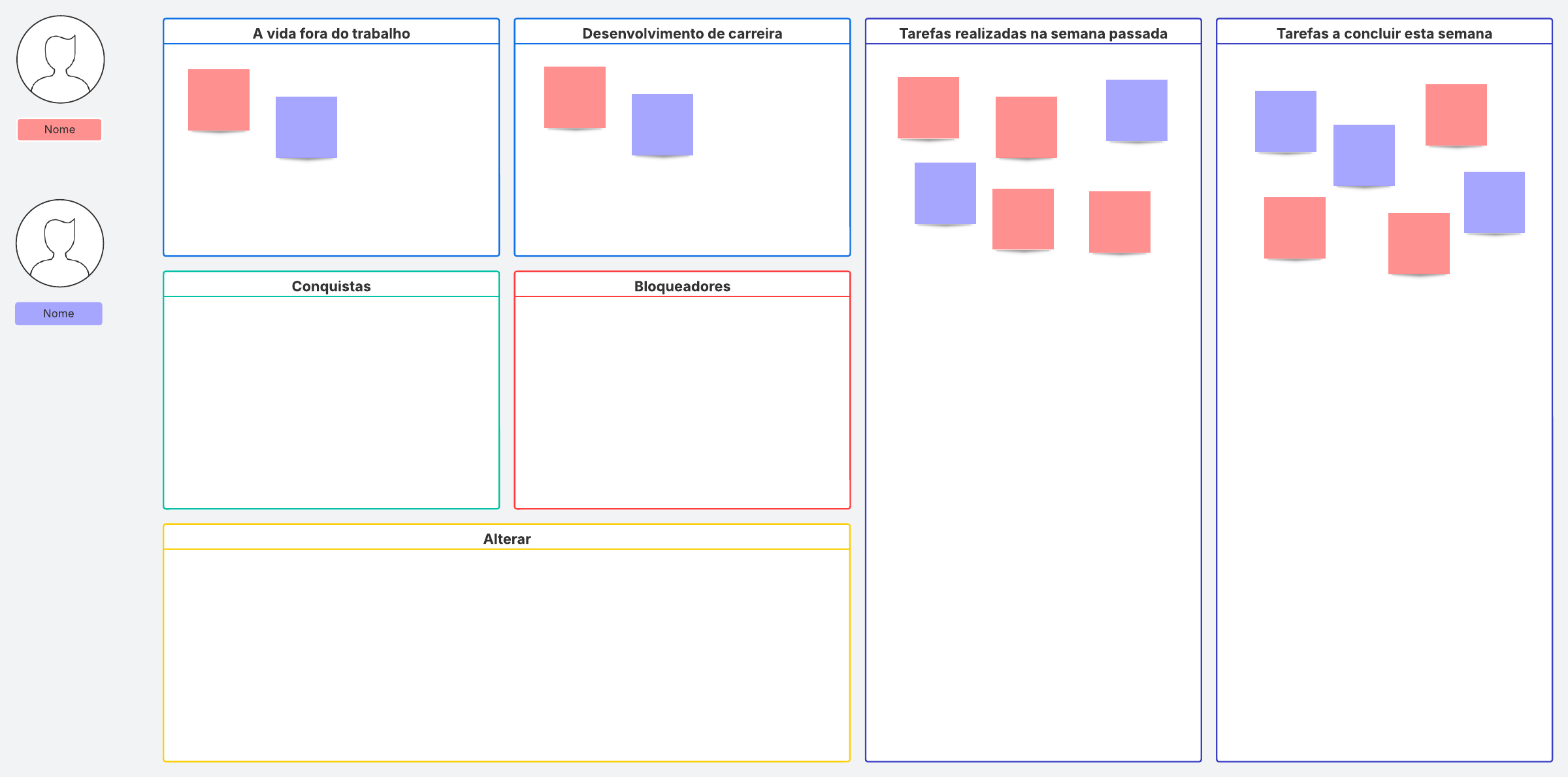 Siga uma agenda para otimizar ainda mais as reuniões individuais. Este modelo de reunião individual ajuda a conversar sobre a vida fora do trabalho, desenvolvimento de carreira, conquistas, dificuldades e opiniões. Acompanhe as realizações da semana passada e as tarefas agendadas.