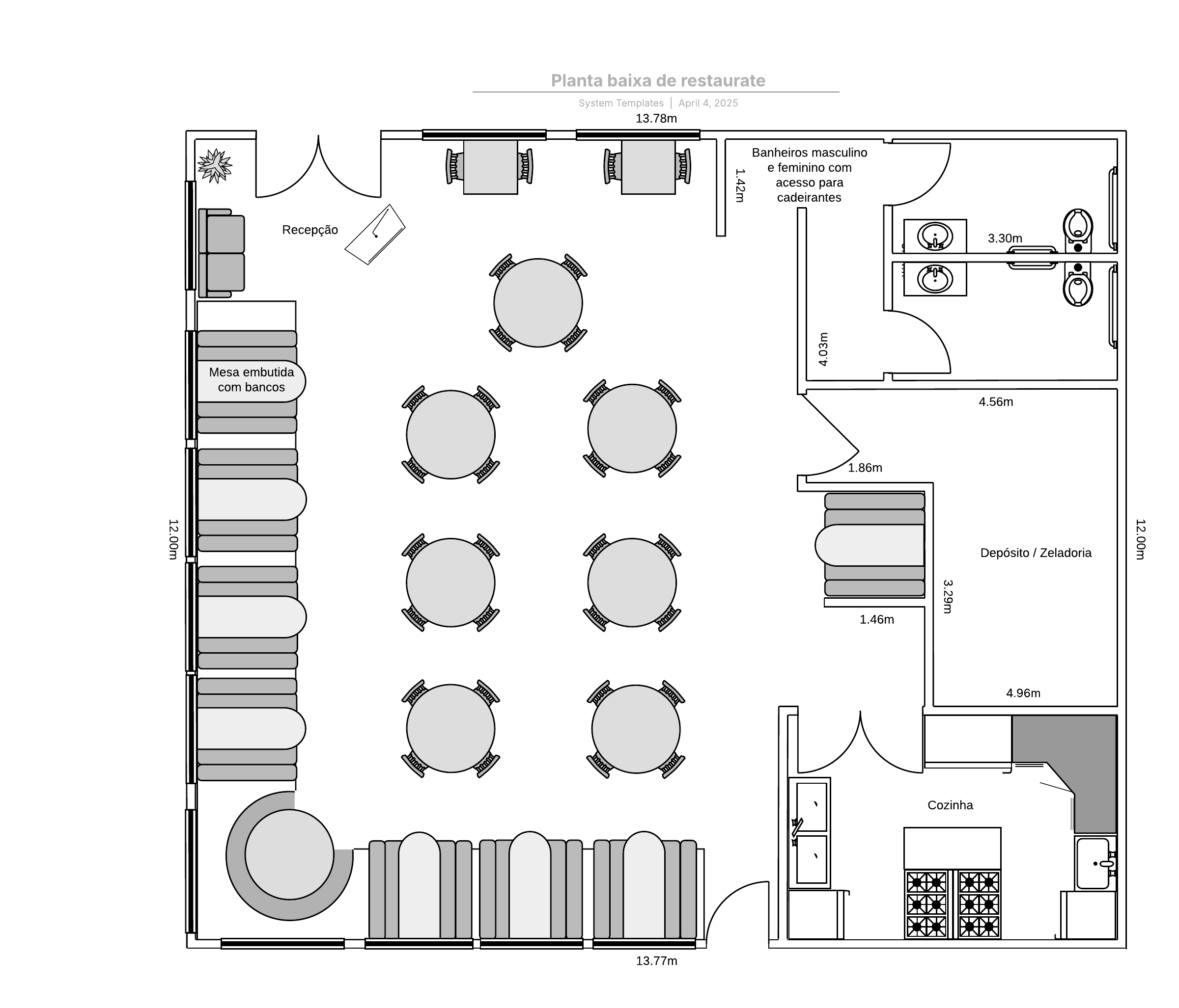 Use esta planta baixa de restaurante para planejar seu negócio. Assim você poderá ver se o espaço será adequado para o que será usado e poderá antecipar qualquer mudança necessária ao projeto.