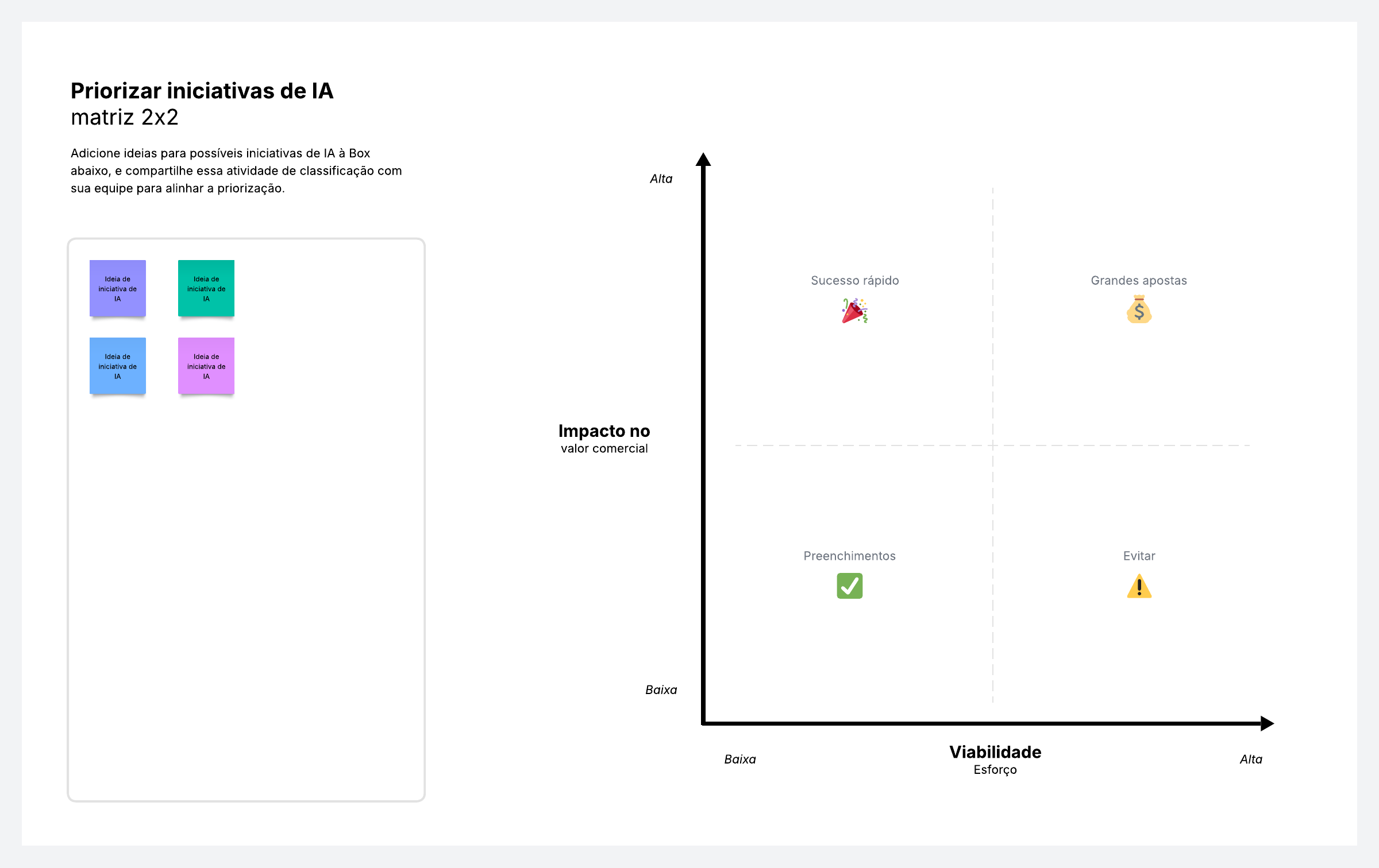 Classifique ideias para iniciativas de IA em uma matriz 2x2 comparando o valor de negócios e a viabilidade.