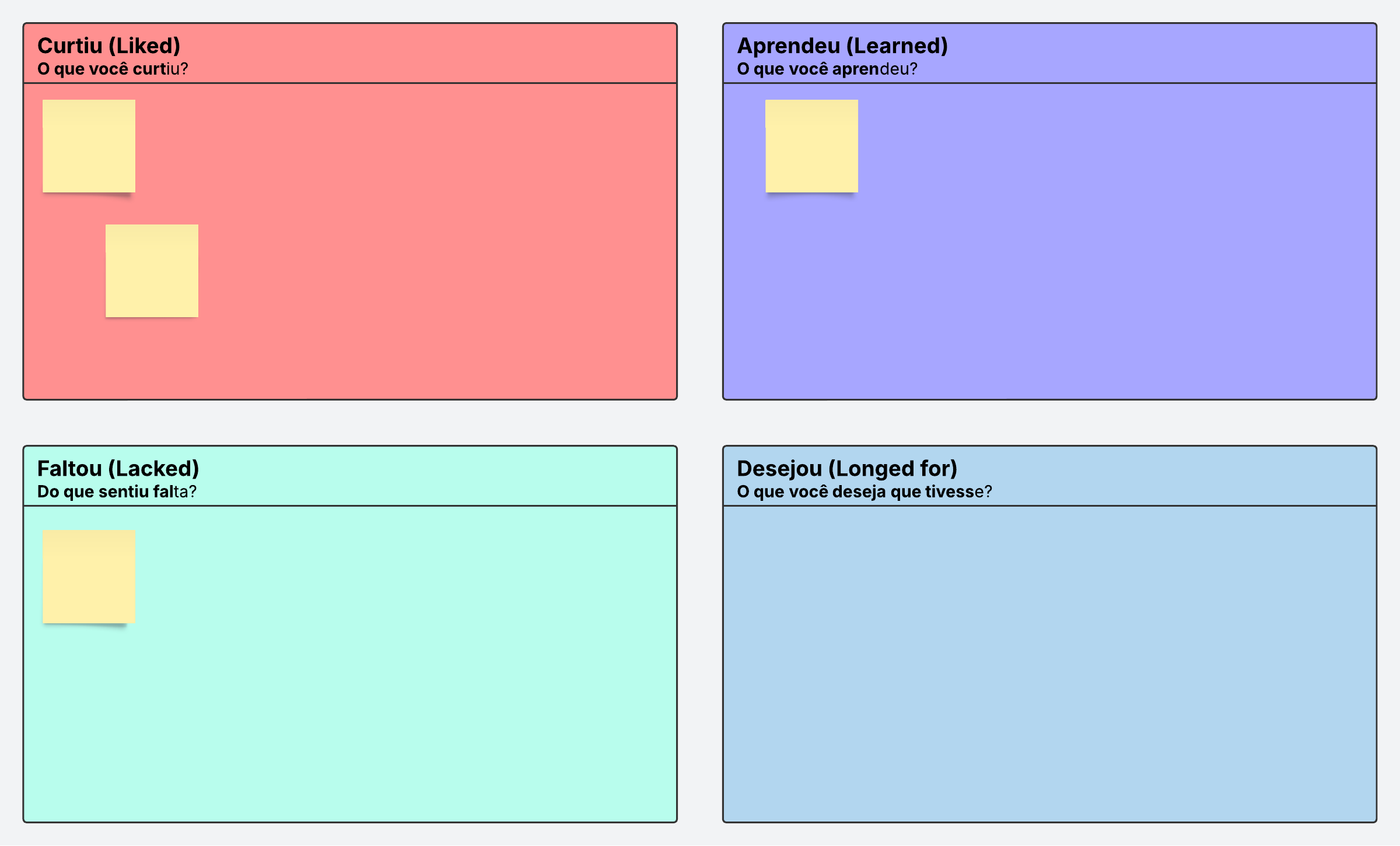Use este modelo de Quatro Ls para organizar sua retrospectiva de sprint e do projeto. Junte sua equipe para conversar sobre o que você curtiu, o que aprendeu, o que faltou e o que você desejou que tivesse, e incorpore essas informações no seu próximo projeto.
