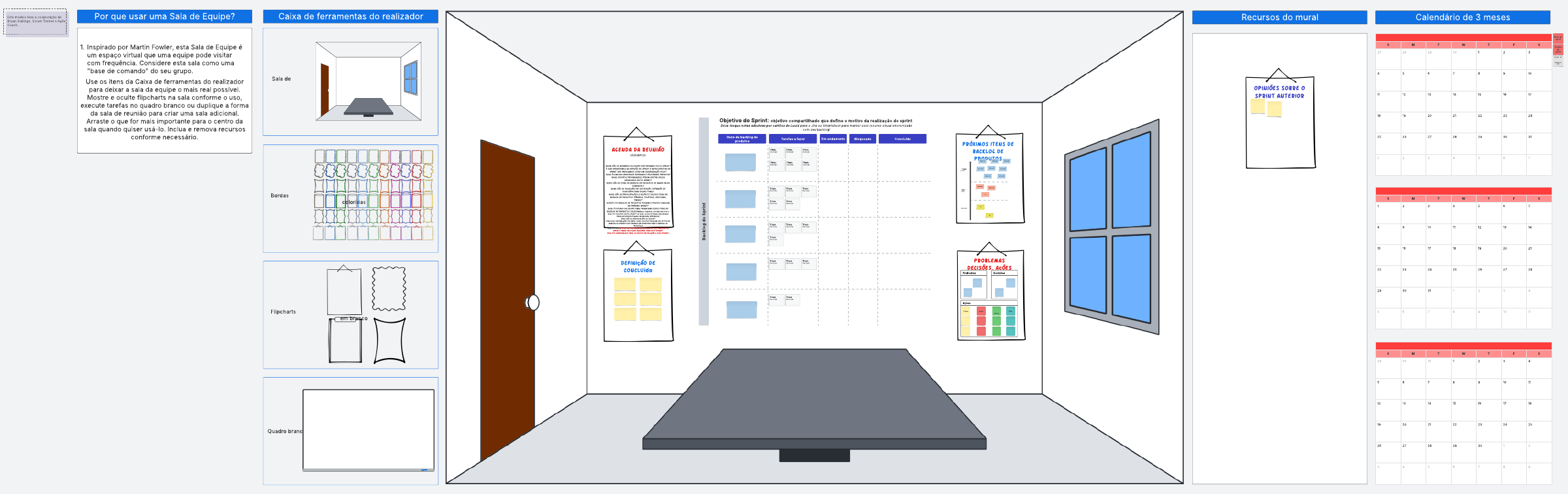 O modelo de planejamento sprint da sala da equipe imita a funcionalidade de uma sala de equipe do mundo real. Esse espaço é ideal para hospedar sessões virtuais de planejamento de sprint para equipes remotas ou híbridas, promovendo a colaboração entre funcionários presenciais e remotos.