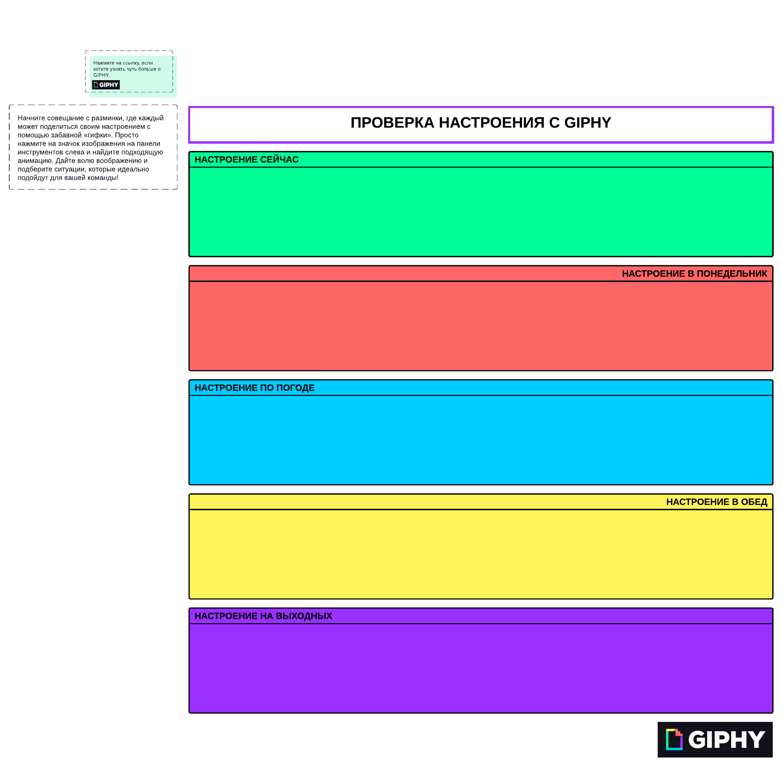 Больше отдачи от мозговых штурмов с конструктором досок настроения. Соберите команду в режиме реального времени или в любое удобное время для обмена идеями, принятия решений и планирования дальнейших шагов.