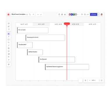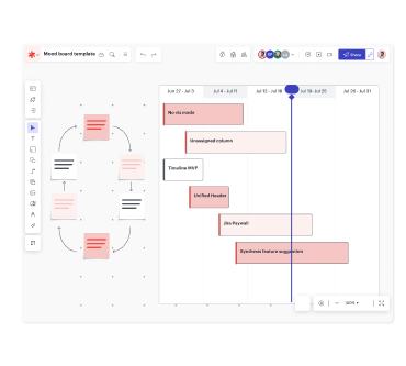 Визуальная совместная работа в Lucidspark дает кросс-функциональным командам возможность отчетливо представить весь рабочий процесс в едином ключе. Здесь каждый может просмотреть временные шкалы и вехи проекта, поделиться соображениями и прикрепить важные ссылки. А благодаря возможности работать сообща в режиме реального времени вы всегда будете иметь дело только с самой актуальной информацией.