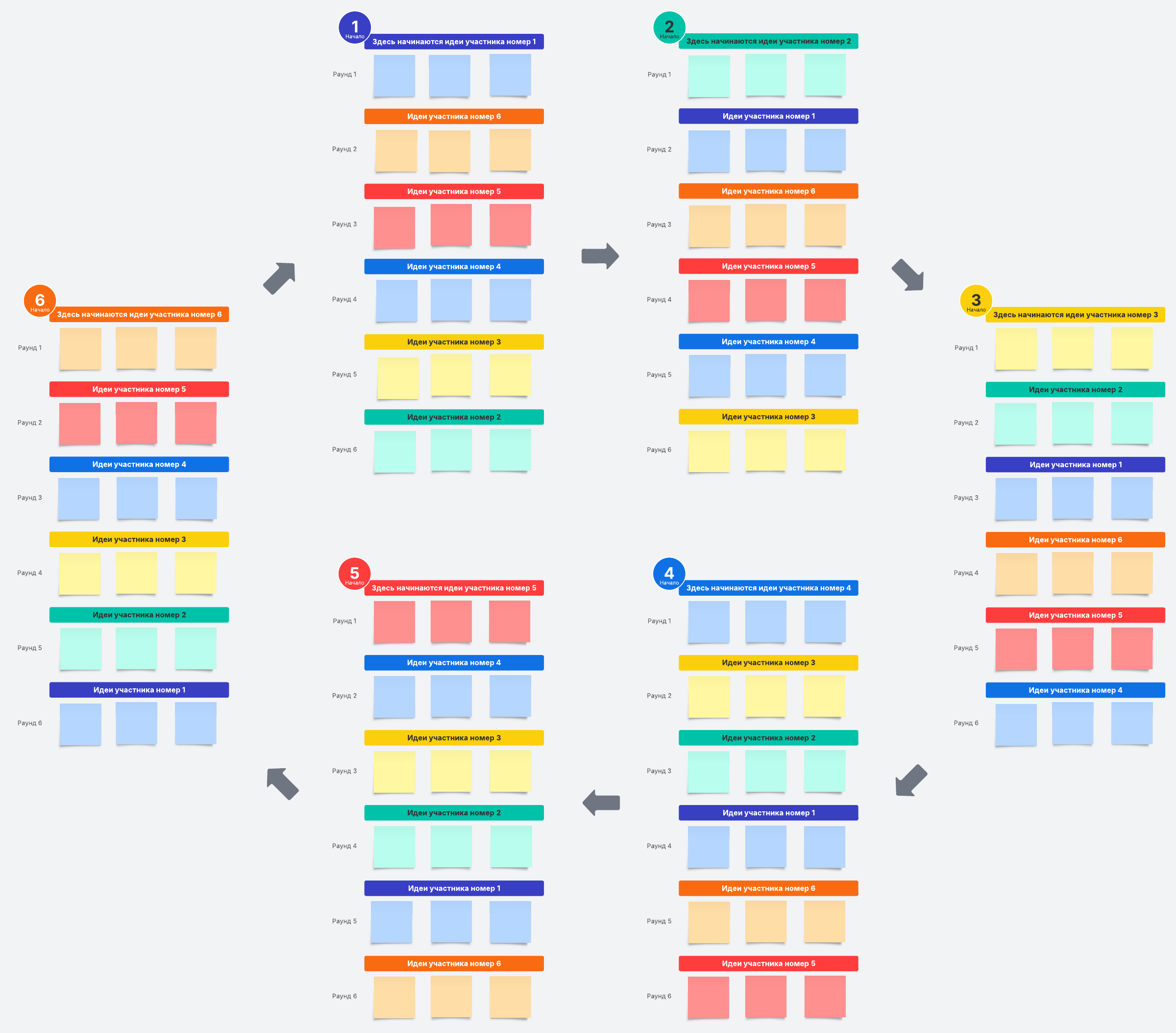 Хотите включить генератор идей? Попробуйте брейнрайтинг по технике 6-3-5. Соберите команду из шести человек и попросите каждого из них записать три идеи за пять минут. Проведите шесть таких раундов и используйте собранные идеи для принятия решения.