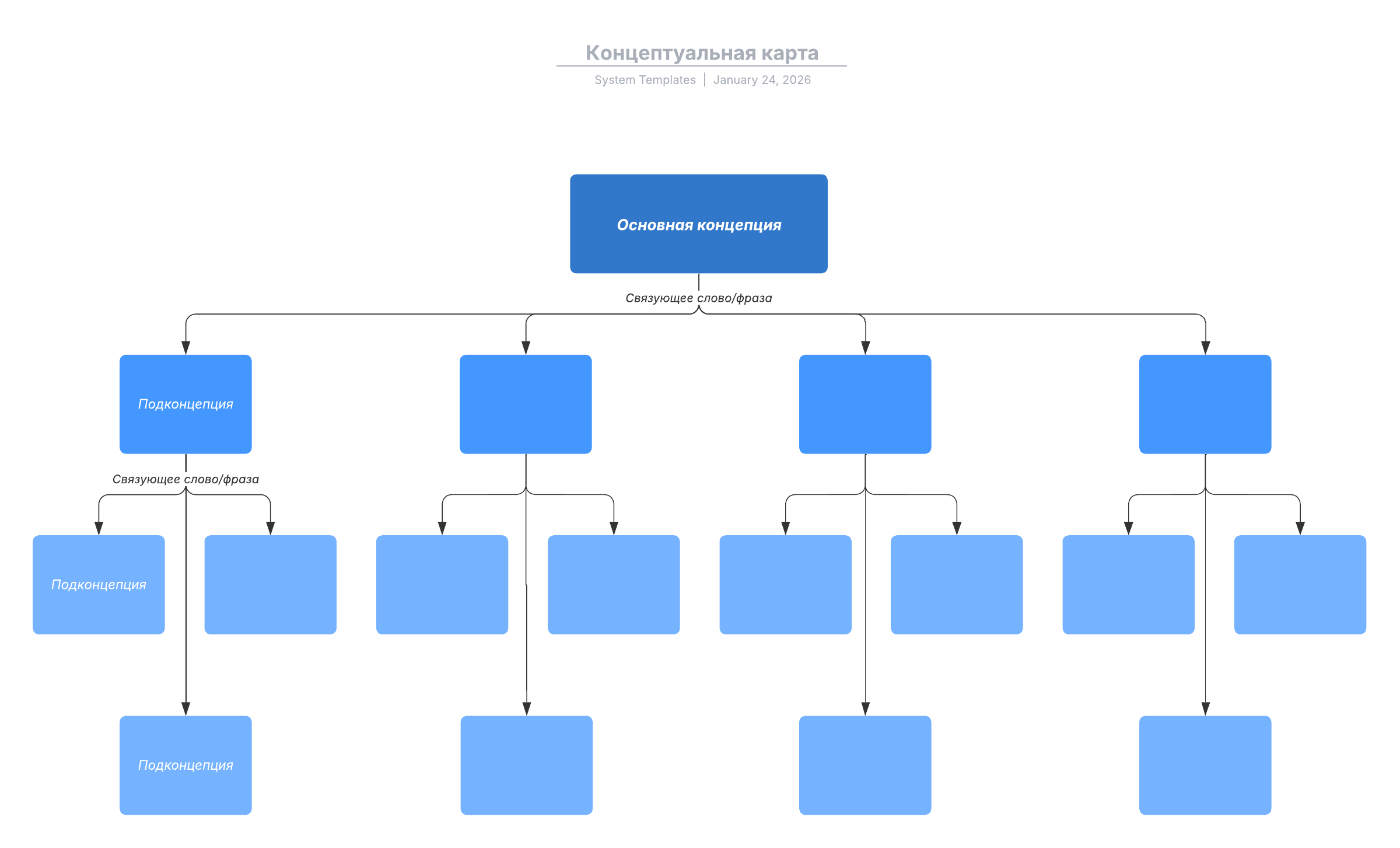 Чтобы подстроить эту концептуальную карту под свой проект, просто откройте шаблон и внесите необходимую информацию.