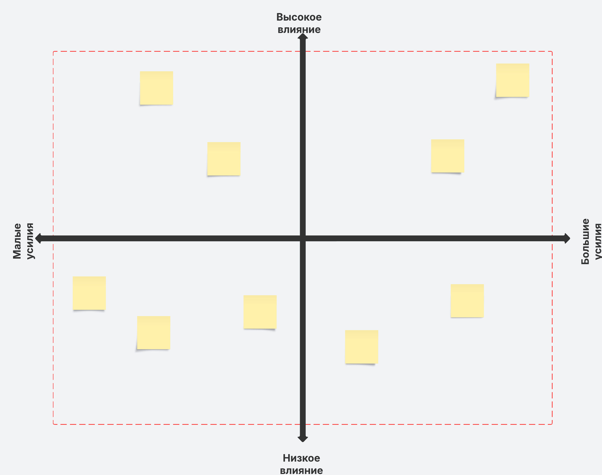 Этот шаблон поможет вам упорядочить и рассортировать идеи с учетом их потенциального влияния на проект и усилий, необходимых для их реализации.
