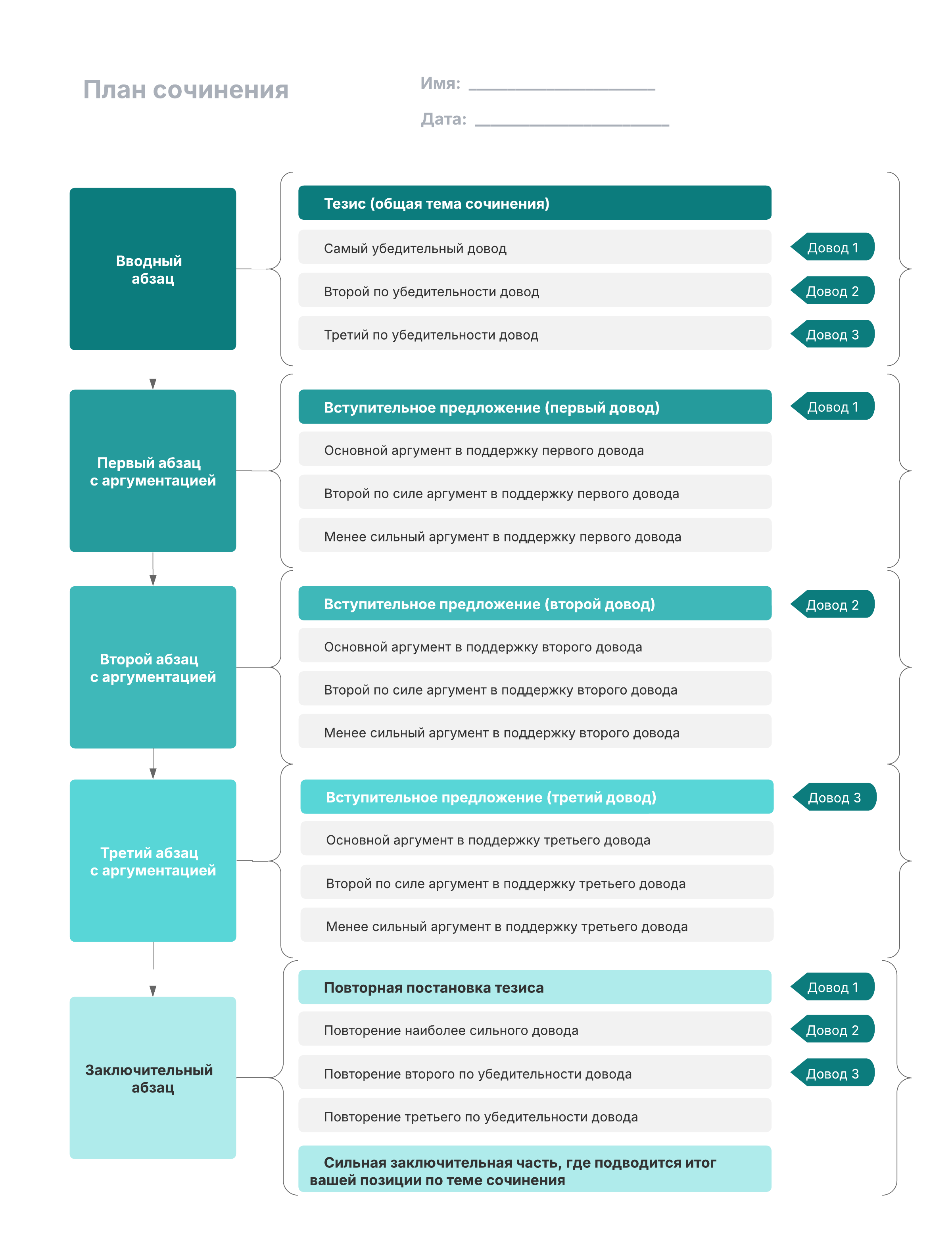 — составить подробный план для написания логичного, убедительного сочинения, подкрепленного фактами;