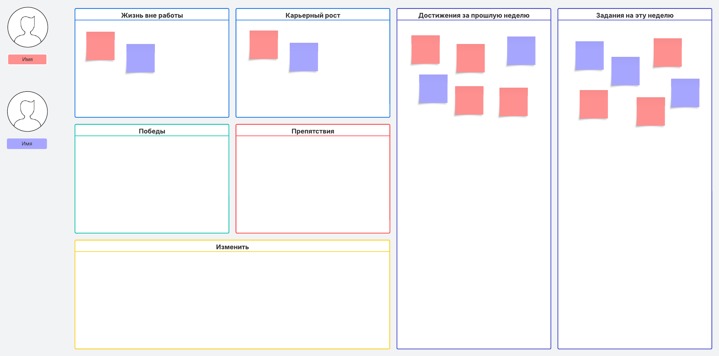 Тет-а-тет, подкрепленный четким планом, пройдет еще плодотворнее. Наш шаблон для встречи один на один поможет вам обсудить с сотрудником жизнь за пределами офиса, карьерный рост, личные победы и камни преткновения, а также резюмировать достижения и задачи на неделю и дать оценку проделанной работе.