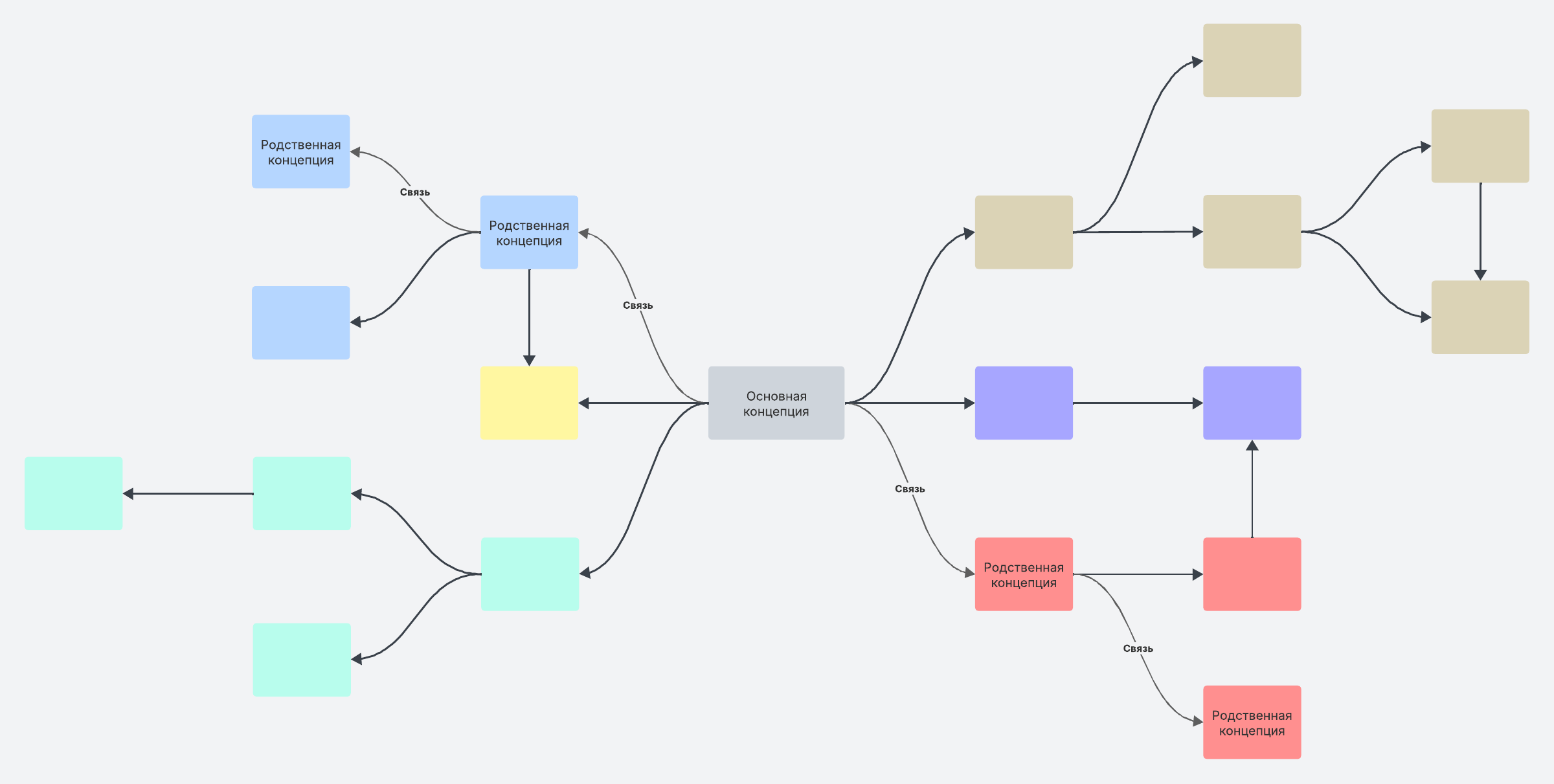 Концептуальная карта поможет наглядно представить связи между понятиями и идеями. Достаточно соединить их линиями со связующими словами или фразами — и все родственные концепции как на ладони!