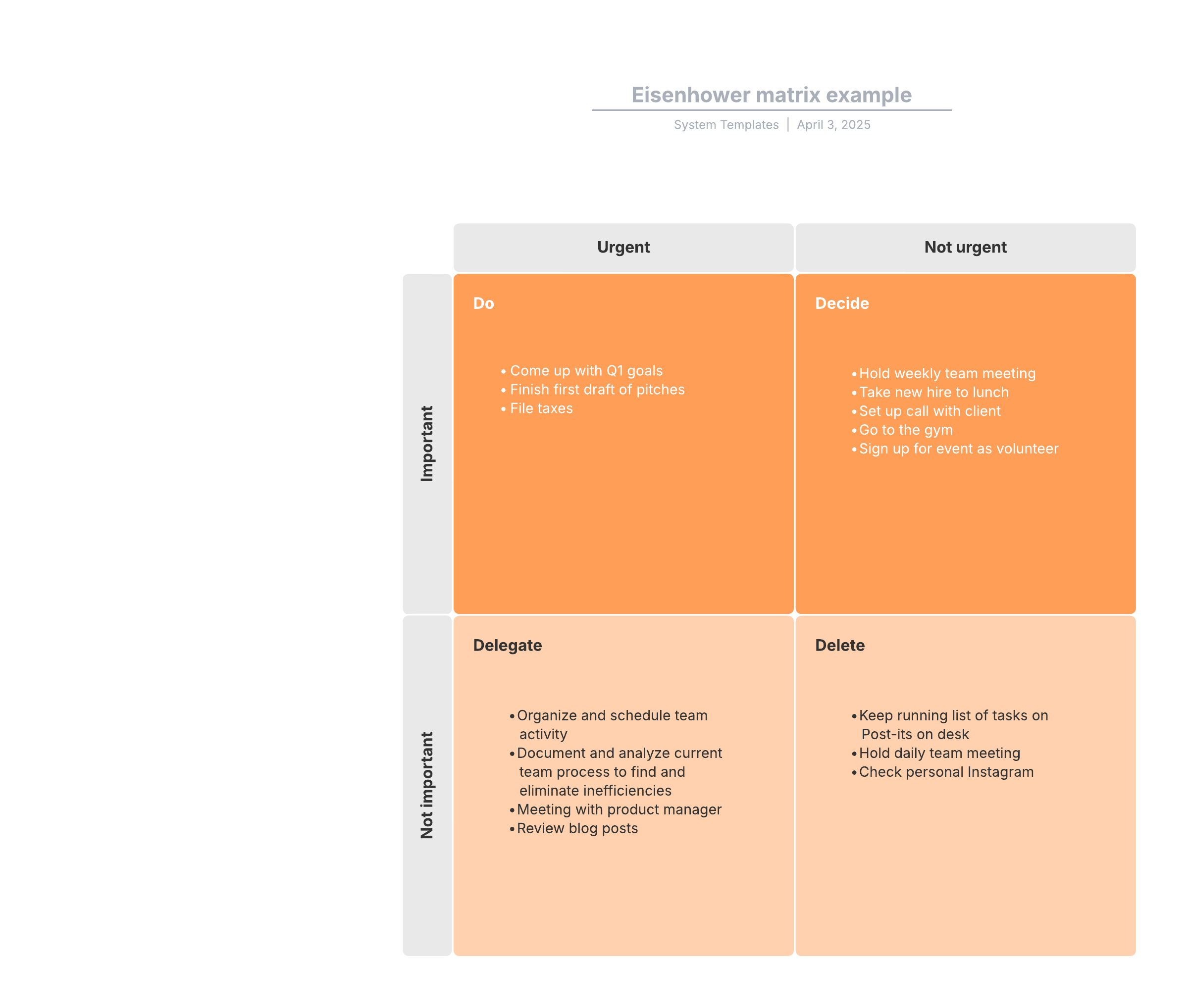 Open this template to view a detailed example of an Eisenhower matrix that you can customize to your use case.