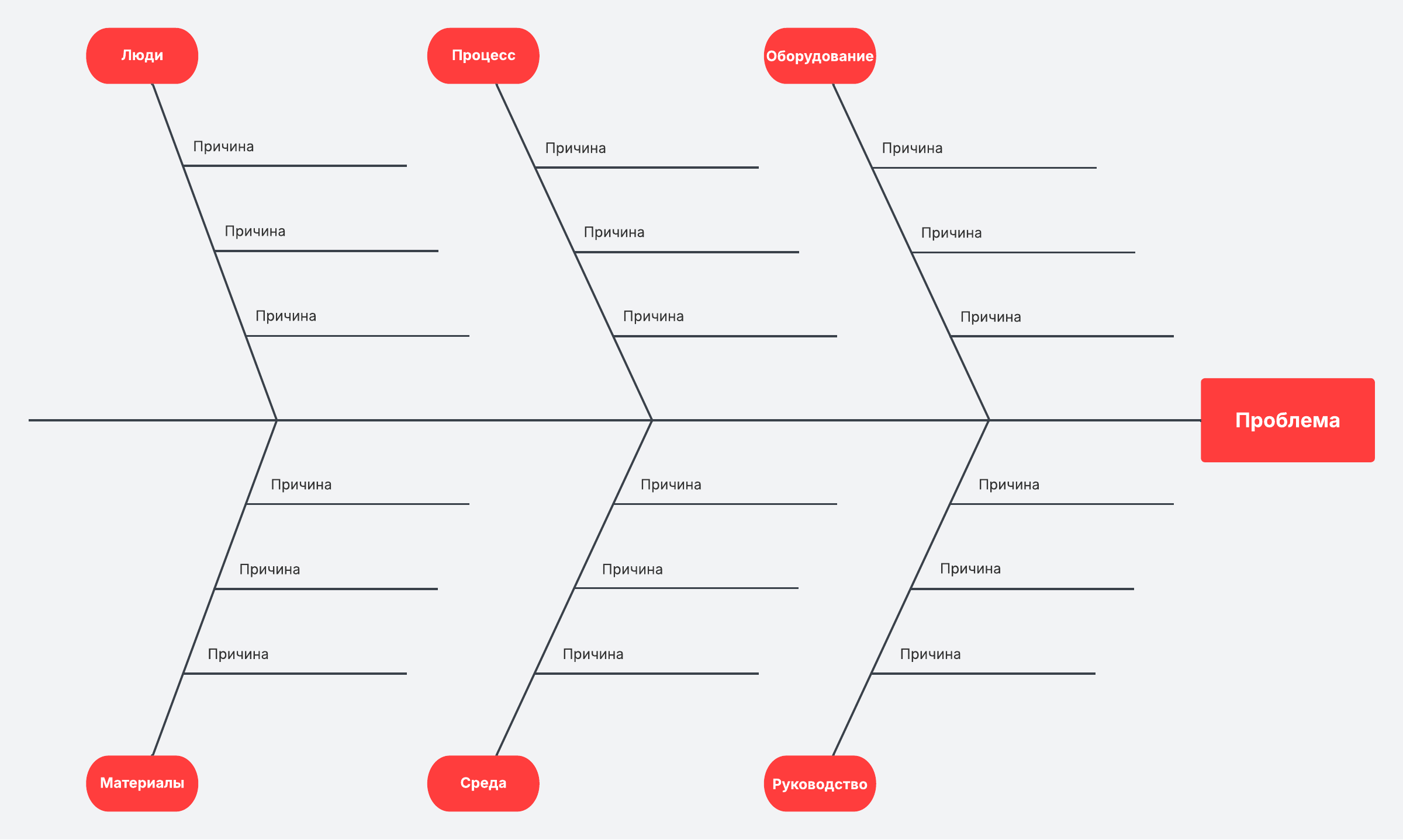 Вместо того чтобы лечить симптомы, попробуйте «докопаться» до корня проблемы. Диаграмма «рыбий скелет» (также диаграмма причинно-следственных связей или диаграмма Исикавы) поможет команде рассмотреть возможные причины проблемы в разных категориях (люди, процессы, оборудование и так далее).
