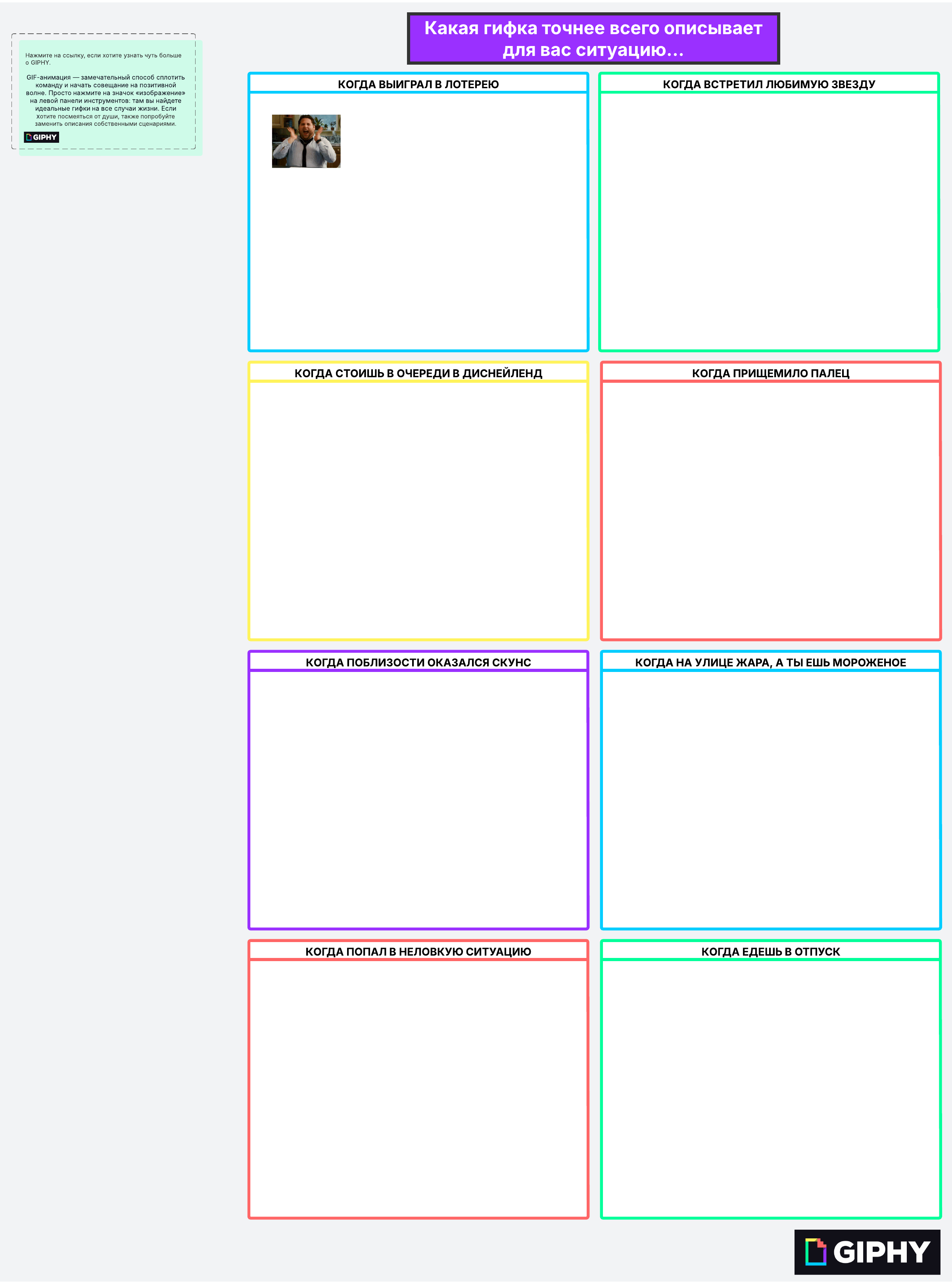 GIF-анимация — замечательный способ сплотить команду и начать совещание на позитивной волне. Просто нажмите на значок «изображение» на левой панели инструментов: там вы найдете идеальные гифки на все случаи жизни. Если хотите посмеяться от души, также попробуйте заменить описания собственными сценариями.