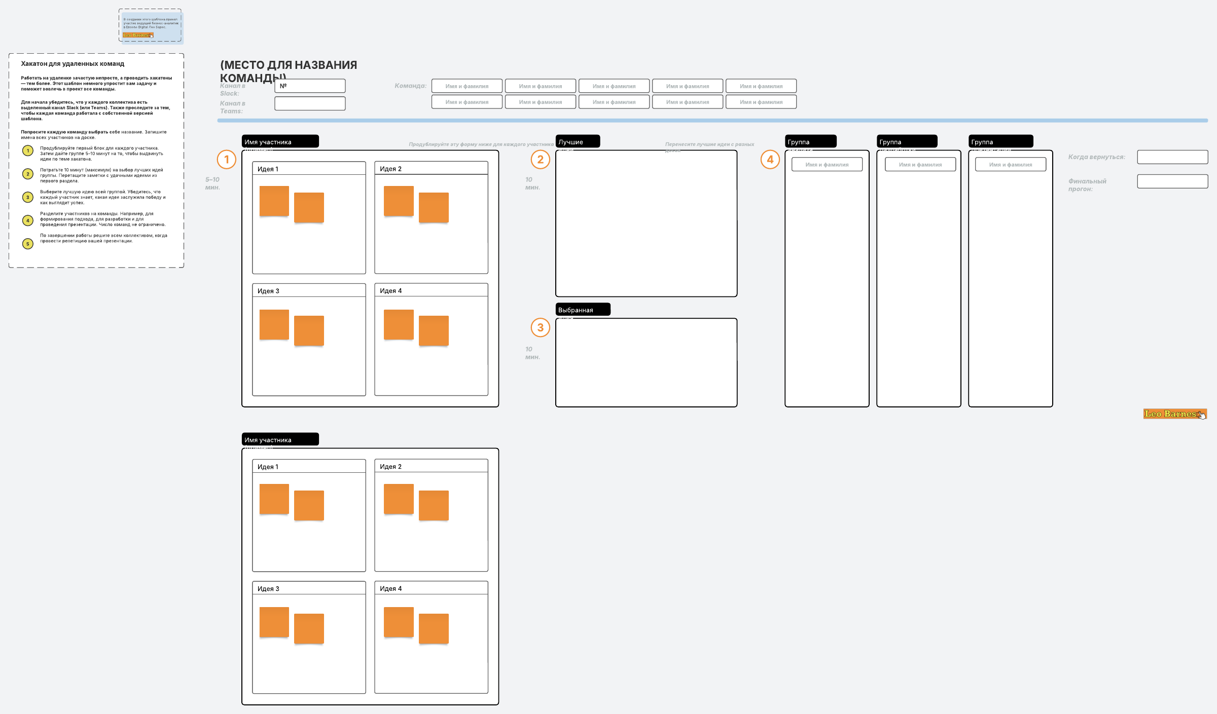 Он упростит вам задачу и поможет вовлечь в процесс всех участников на протяжении всего мероприятия, позволяя удаленным командам работать над проектом как одно целое. Шаблон послужит единым ресурсом, который поддержит энергию и продуктивность хакатона, невзирая на расстояния.