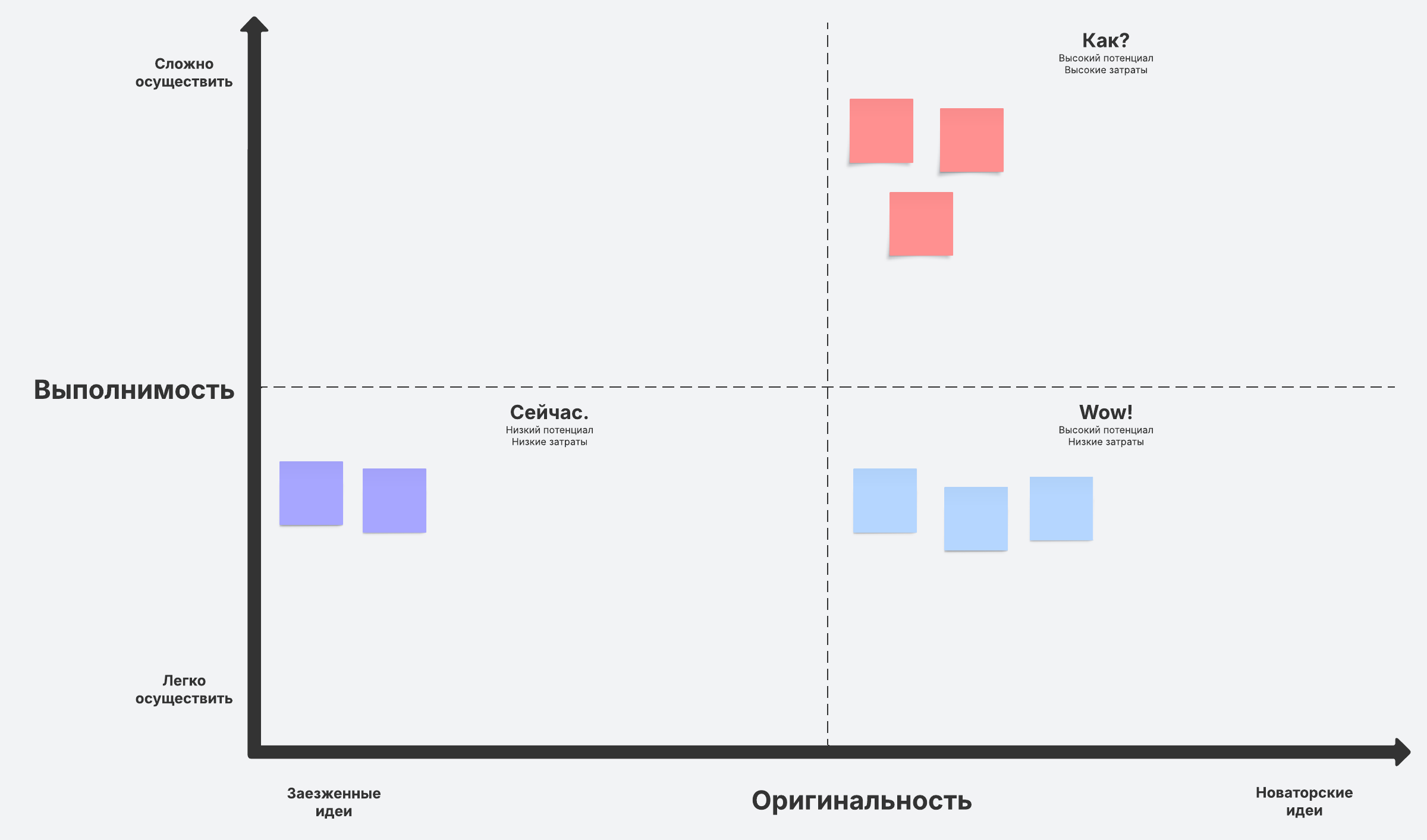 Оцените идеи с точки зрения выполнимости и оригинальности при помощи матрицы How, Now, Wow! Просто заполните ее идеями, и вы увидите, какие из них отличаются новаторством и при этом не требуют много времени на внедрение.