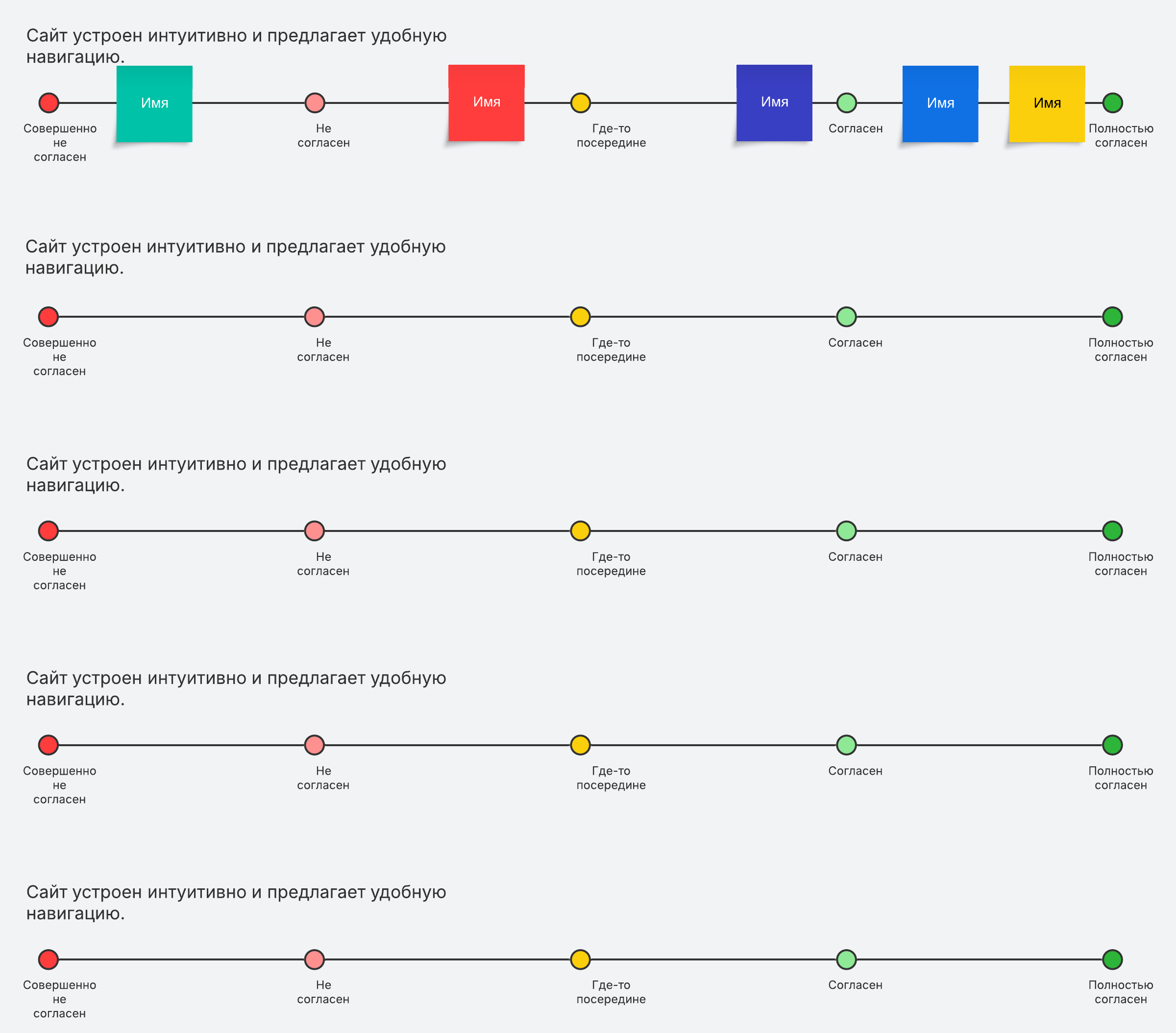 Шкала Лайкерта — это оценочная шкала, которая широко применяется в опросах. Просто дополните ее липкими заметками, чтобы замерить, насколько пользователи поддерживают то или иное высказывание.