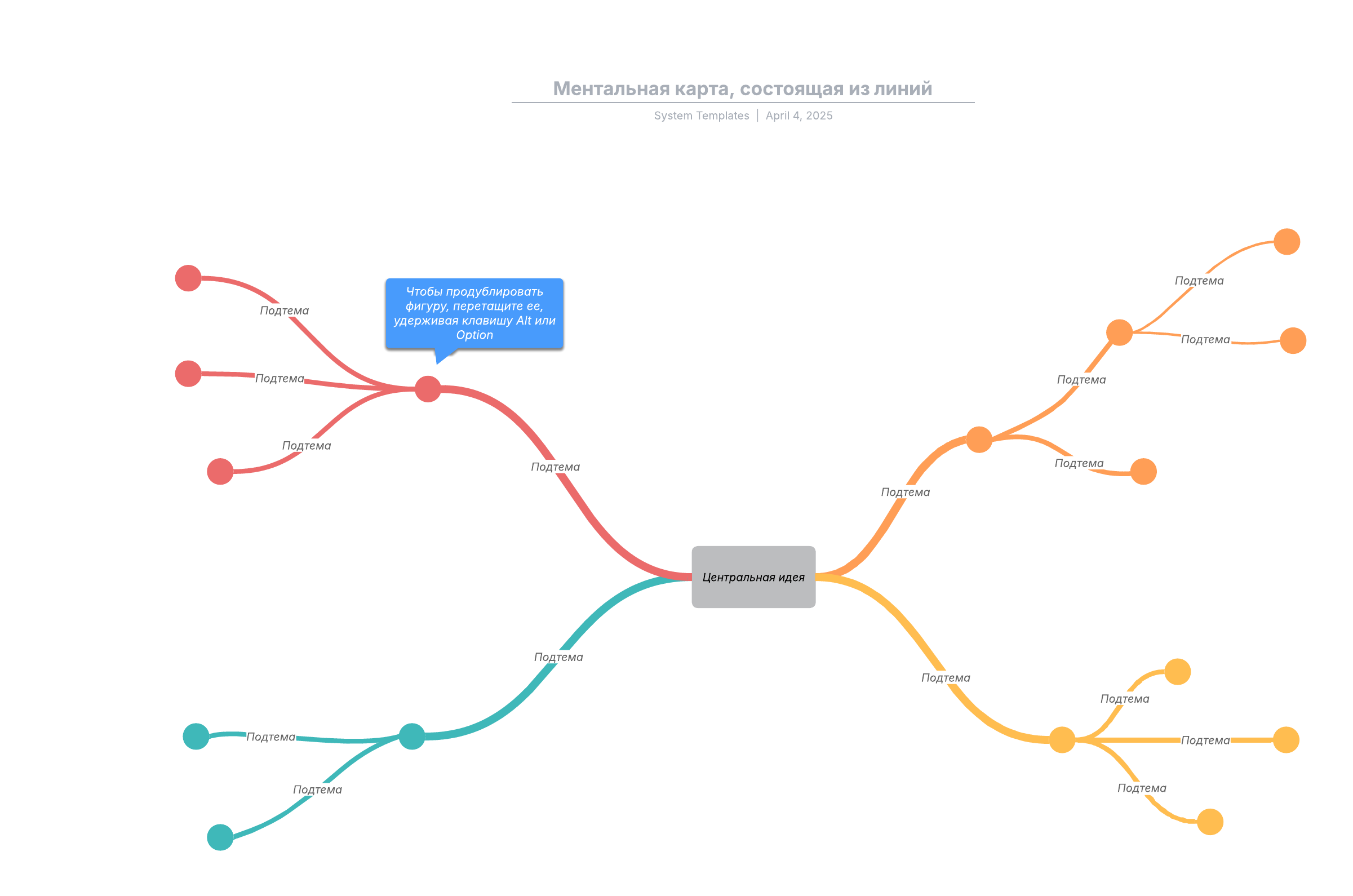 Чтобы подстроить данный шаблон ментальной карты под свой проект, просто откройте его и добавьте собственное содержимое.