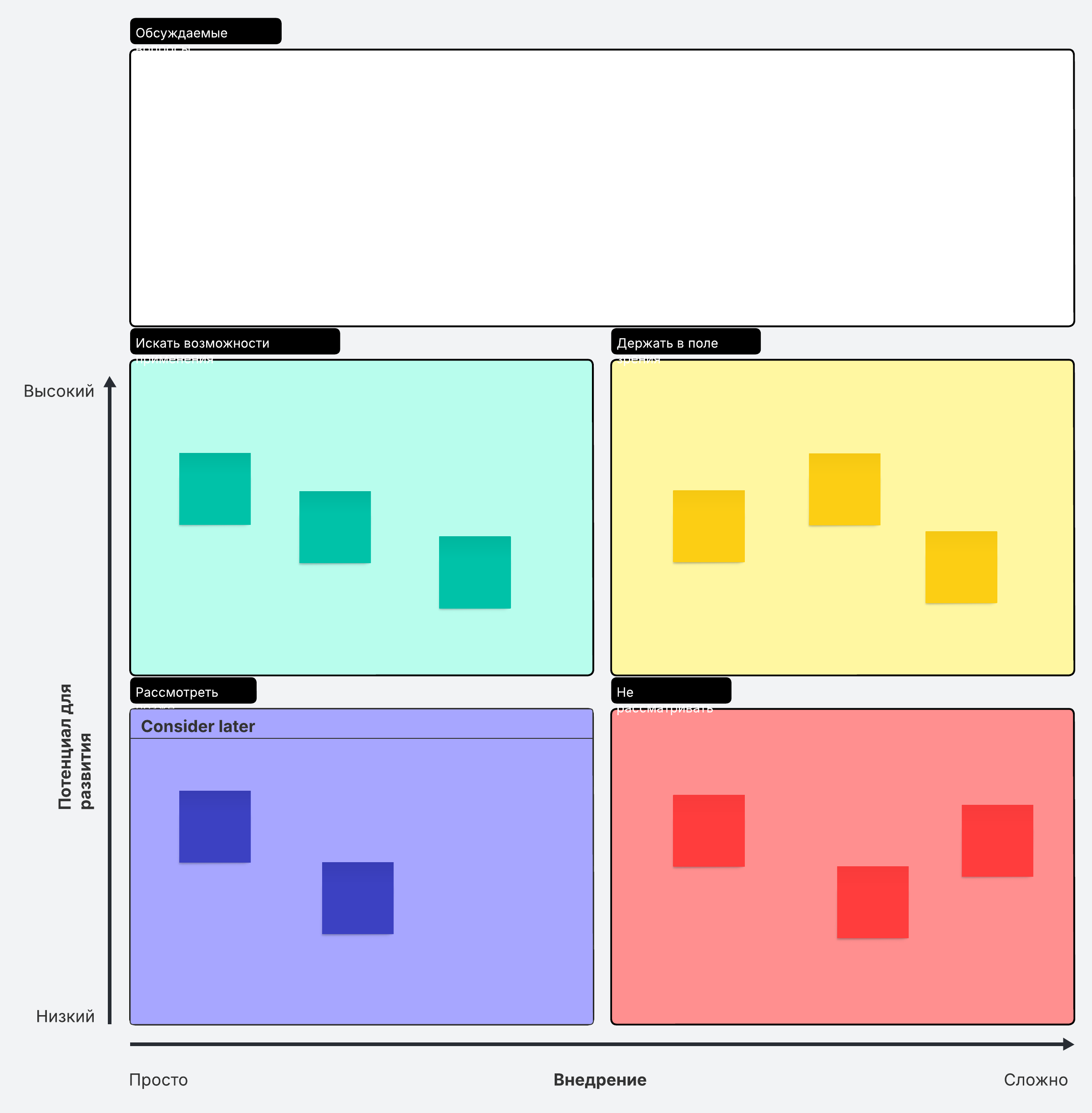 Когда под рукой есть матрица с парковкой идей, вы без труда проведете дискуссию, не отвлекаясь от главного. На парковке вся команда сможет оставить идеи, комментарии и вопросы, которые выходят за рамки повестки дня, но пригодятся впоследствии. Остальные сегменты позволят вам упорядочить идеи согласно их потенциалу для развития и возможности внедрения.