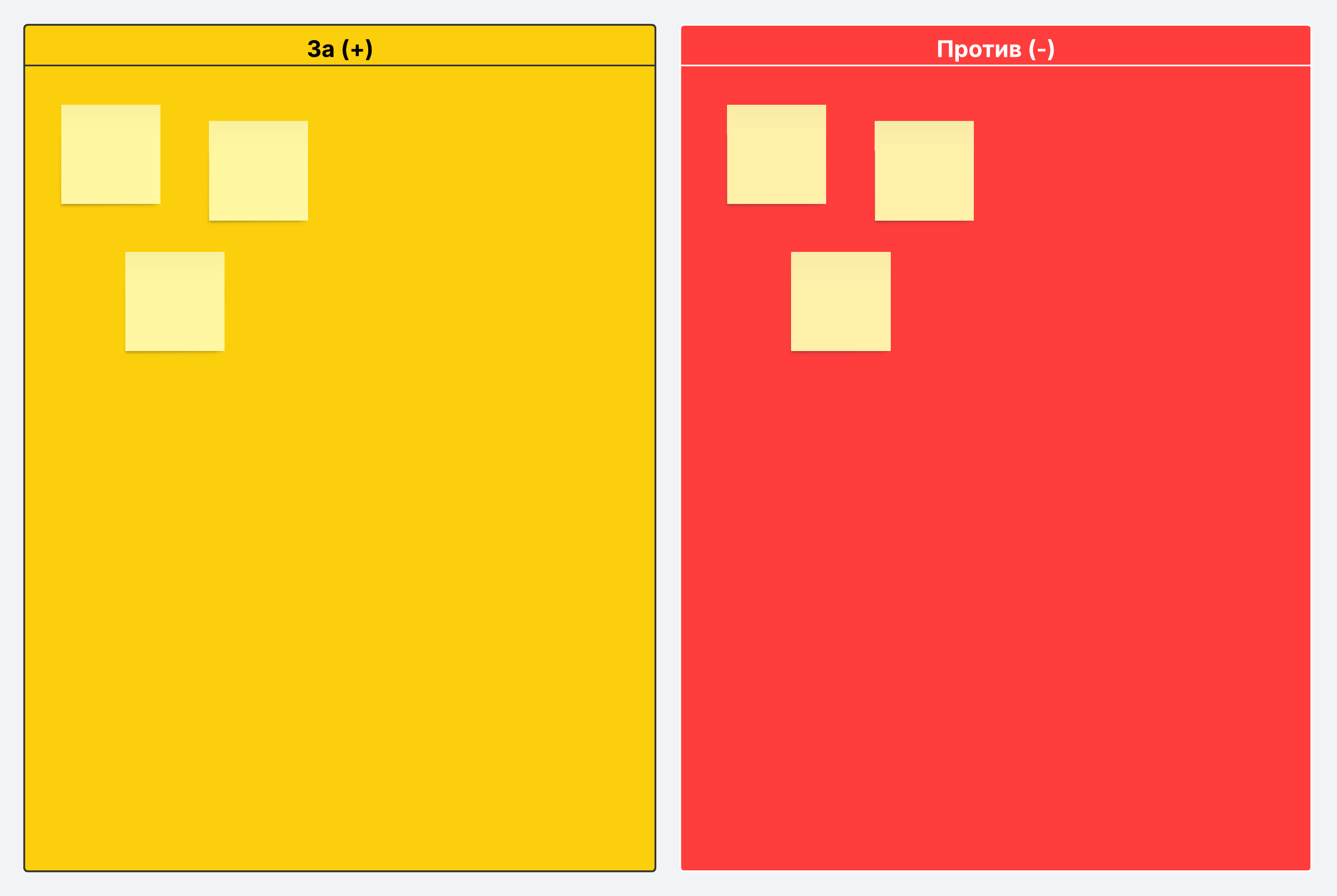 Список всех «за» и «против» — проверенный временем метод принятия решений. Мы же предлагаем его в цифровом варианте. Суть метода проста: самостоятельно или в команде перечислите как можно больше аргументов в пользу и против принятия того или иного решения и, исходя из этого, выберите оптимальный вариант дальнейших действий.