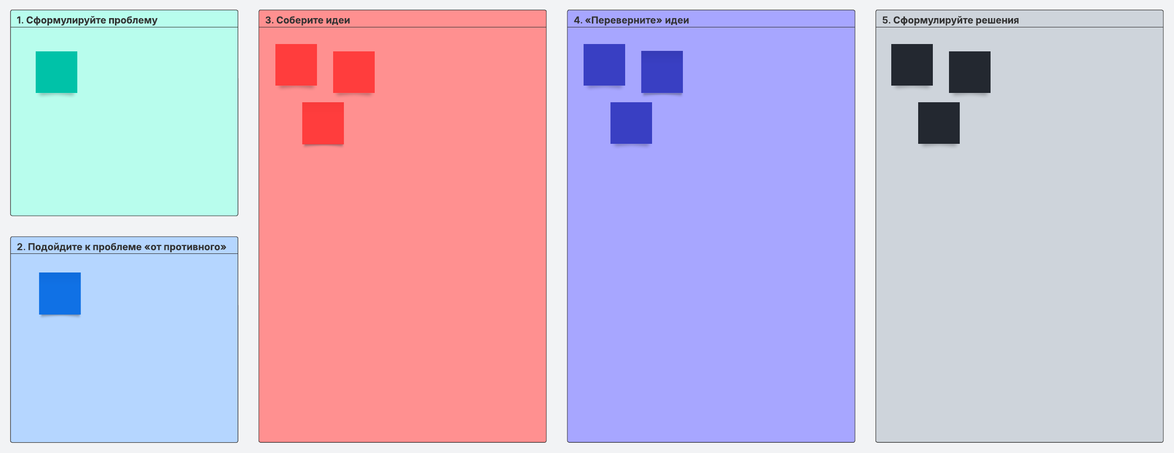 Обратный мозговой штурм позволяет сначала сосредоточиться на самой проблеме и только потом предлагать решения. Участникам предстоит подойти к проблеме «от противного», то есть проанализировать ее причины, а затем собрать идеи и выдвинуть возможные решения.