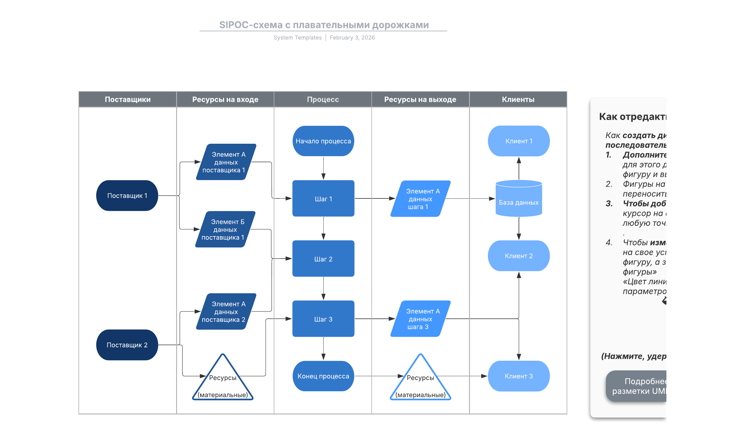 Откройте шаблон, чтобы подробнее рассмотреть наш пример и настроить его под свой проект по методу SIPOC.