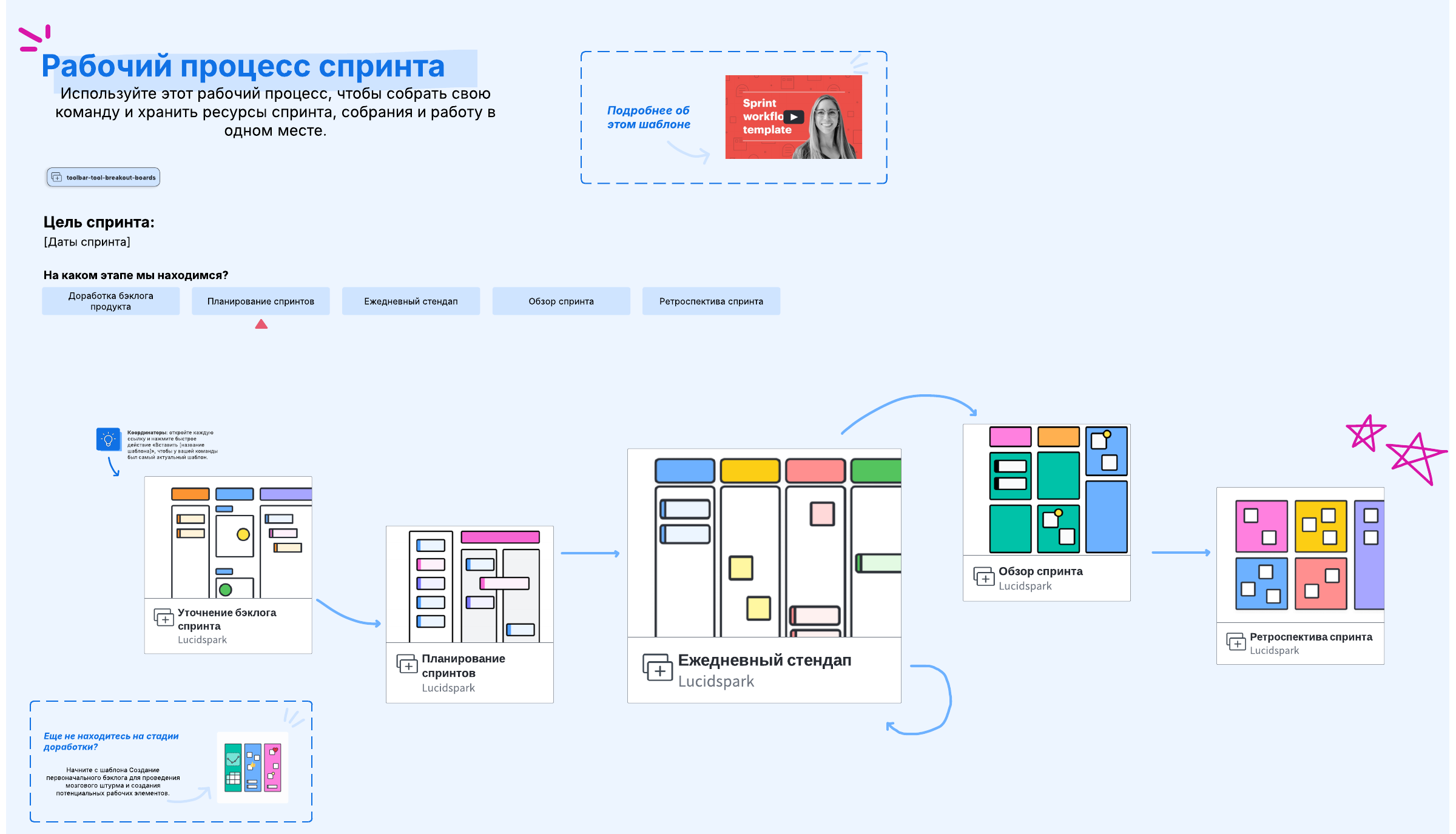 Оптимизируйте все события Agile в вашем спринте, удобно разместив их в одном месте с помощью этого шаблона. Он предварительно сконфигурирован таким образом, чтобы на одной доске можно было отслеживать бэклог продукта, оценивать и планировать спринты, проводить ежедневные стендапы, анализировать спринты и проводить ретроспективы.