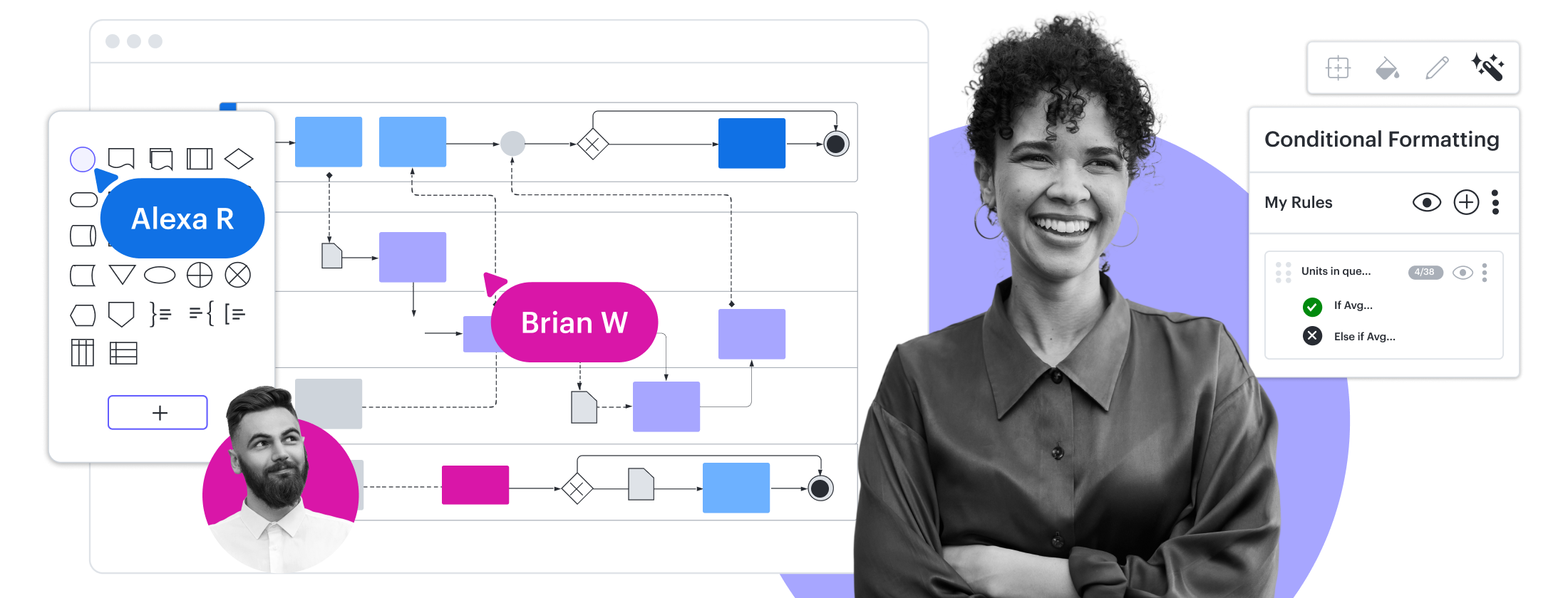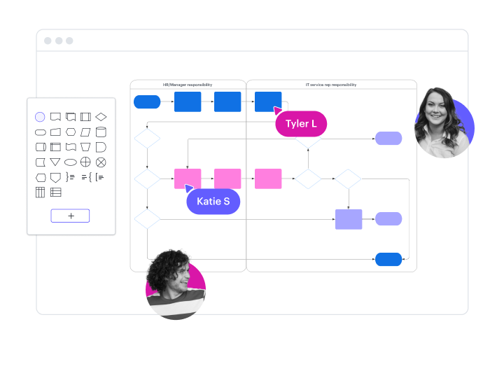 Use custom shapes to visualize a flow for onboarding new employees. Improve your process with commenting and task assignments.