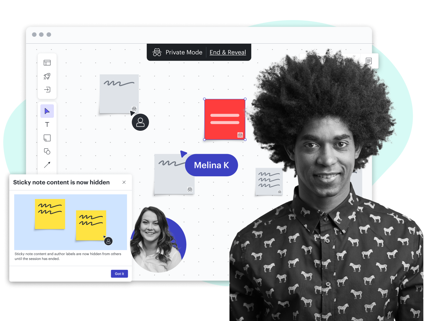 Utnyttja funktioner som visuella aktiviteter, breakout-ytor och tidsbestämd omröstning för att mäta åsikter och uppnå enighet. Kom överens och fatta välgrundade beslut snabbare – direkt i brainstormingytan.