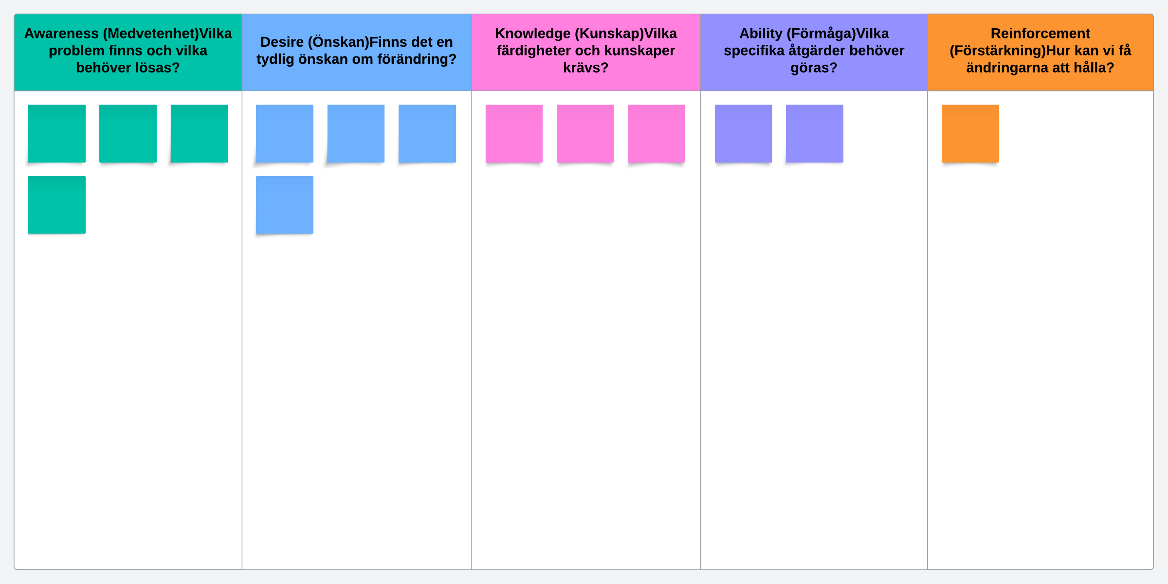 Det finns många ADKAR-mallar, men med Lucidsparks mall blir det enkelt att samarbeta med och få feedback från relevanta anställda och intressenter. Dela först ADKAR-mallen till din whiteboard för att börja använda den i Lucidspark. Lägg sedan till lämpliga objekt i varje avsnitt enligt följande: