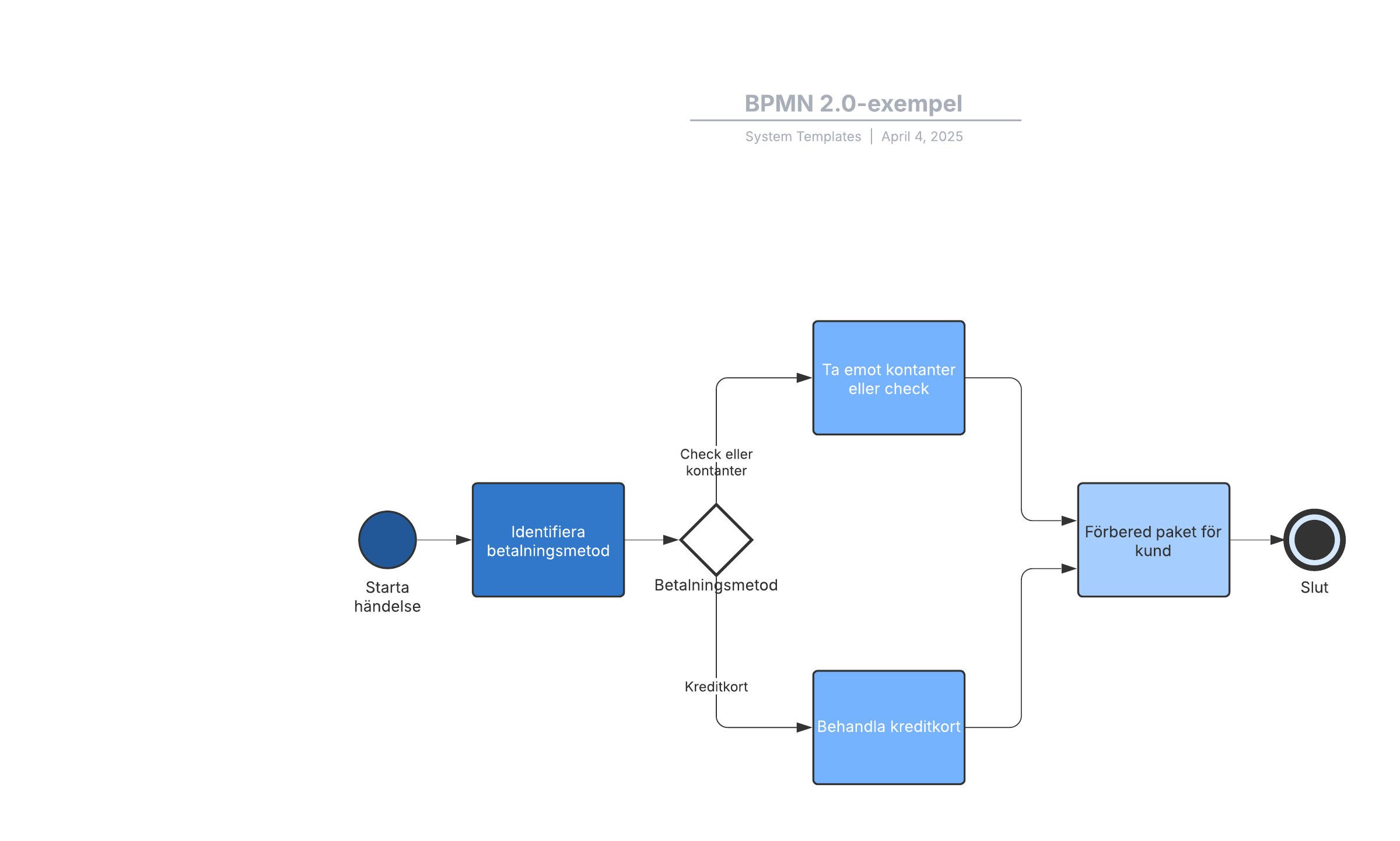 Öppna den här mallen för att visa ett detaljerat exempel på ett BPMN 2.0-diagram som du kan anpassa efter dina behov.