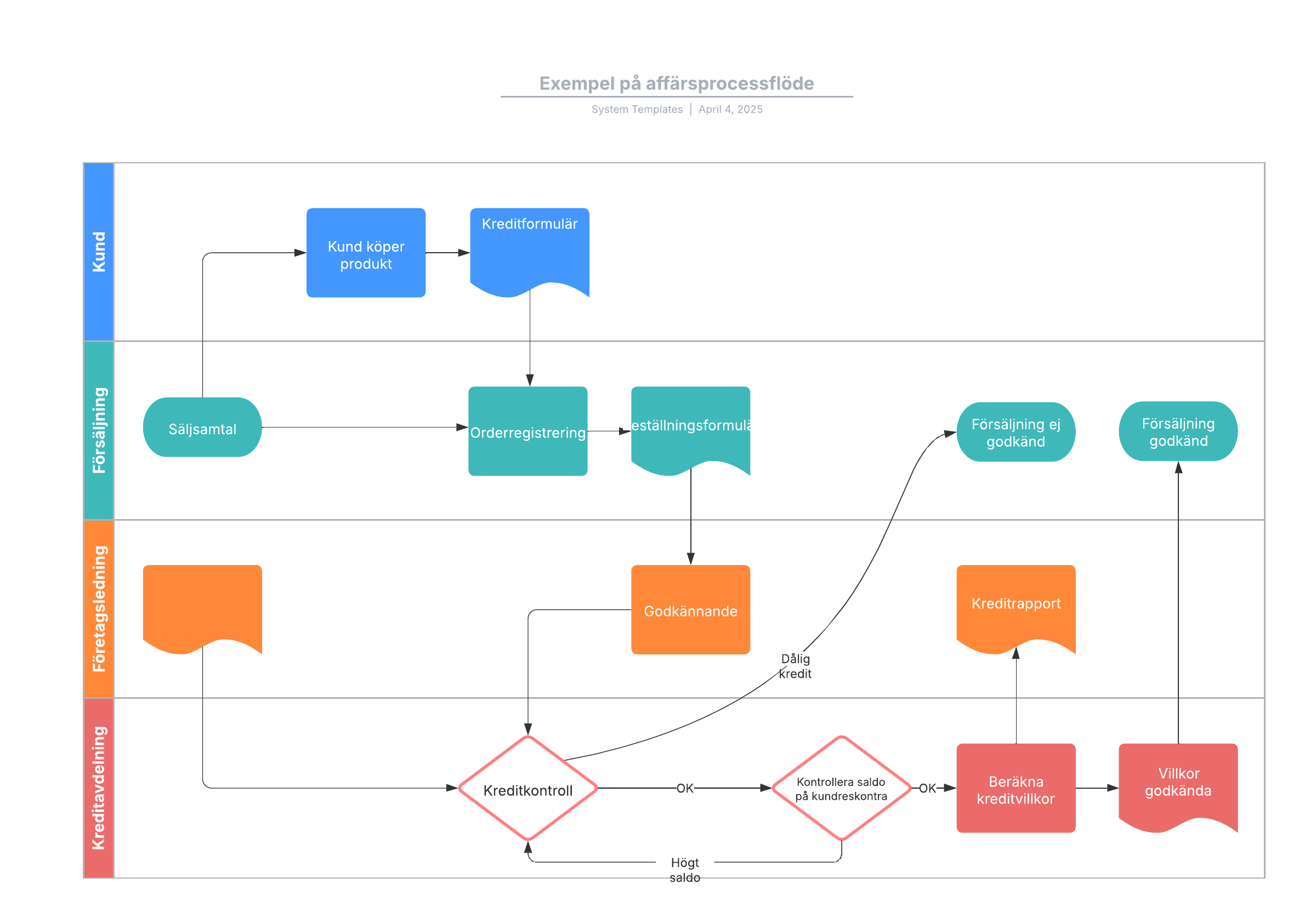 Öppna den här mallen för att visa ett detaljerat exempel på ett affärsprocessflödesdiagram som du kan anpassa efter dina behov.